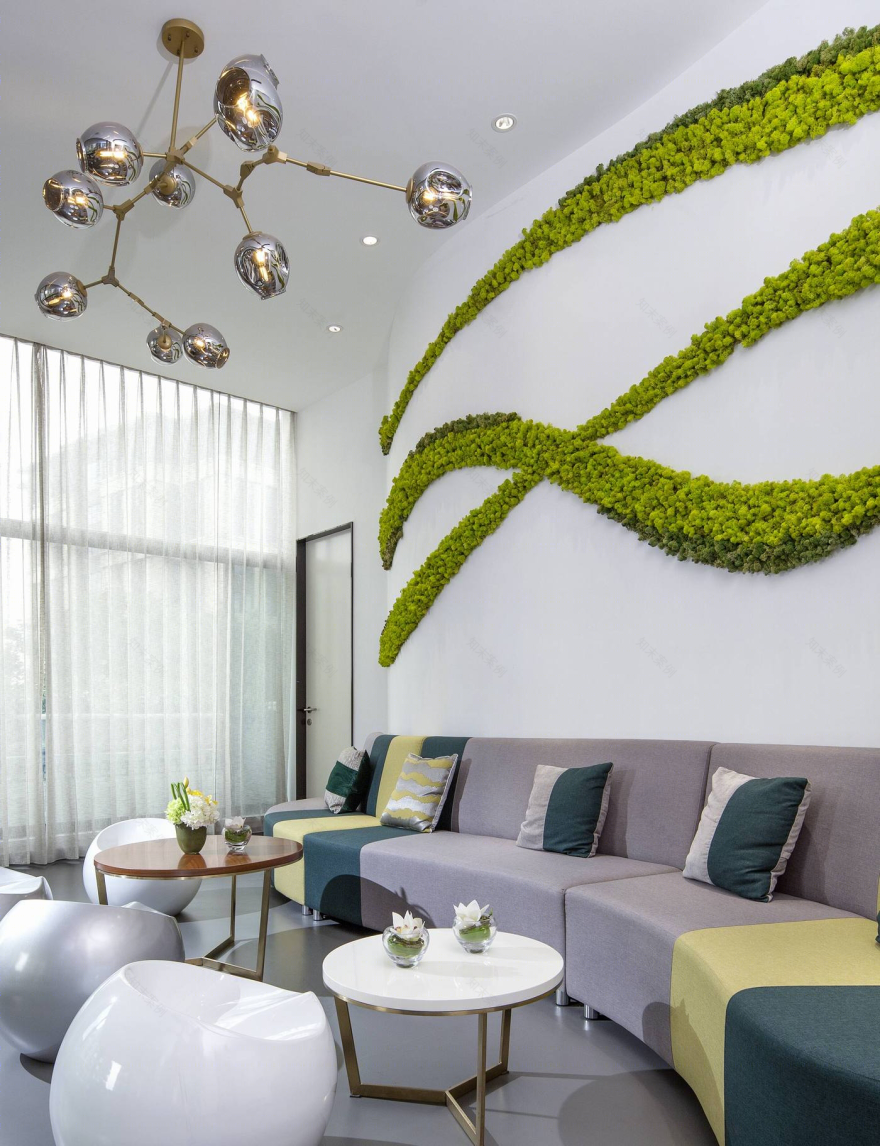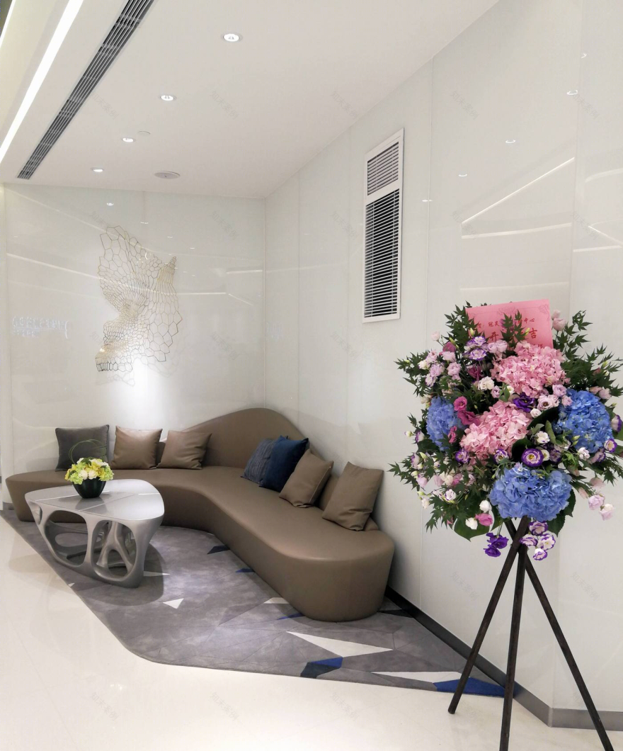 在大厅等待区的一角,设计师巧妙地摆放了不规则的沙发和茶几,其中一款以建筑大师扎哈风格设计的月亮沙发尤为引人注目。这个独特的沙发设计赋予了区域一角璀璨夺目的光芒,其立体感的造型为空间注入了精心设计的元素。