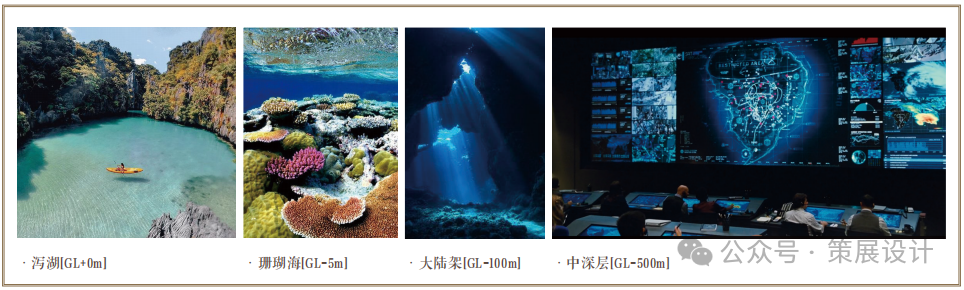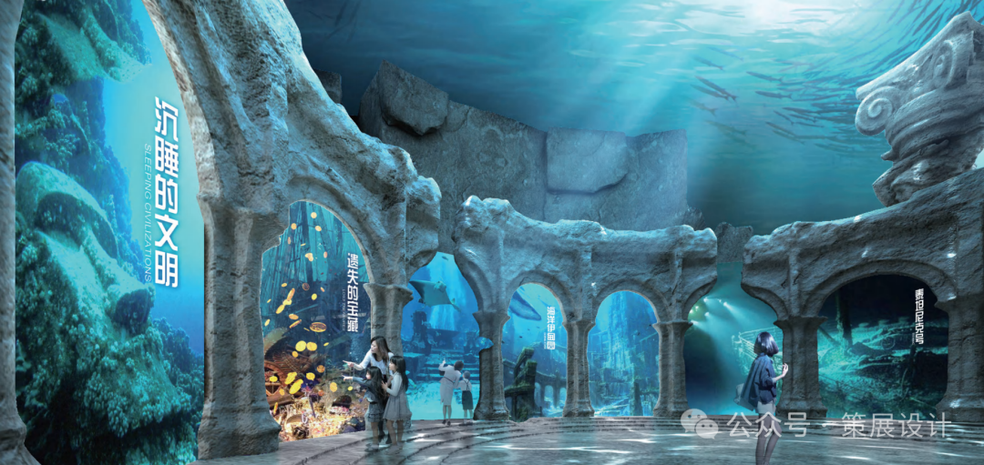 海洋体验从海平面开始,模拟从陆地到达海底的旅行过程。整个体验区由泻湖、珊瑚海、大陆架、中深层、深海层、超深海层、海底都市七个区域构成。