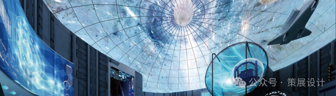 太空体验区的顶面为 360 度透明玻璃穹顶,并投有太空星云景象,为观众模拟真实宇宙场景。墙面也配有触摸屏,展示不同星系的信息。