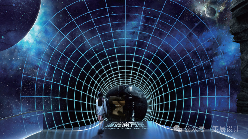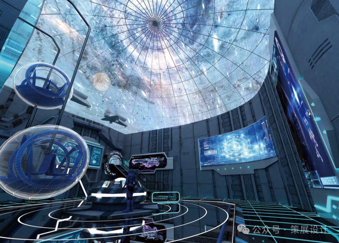 人工智能互动+交互式沉浸体验+7D太空影院:展区内设置缆车通道贯穿海洋、太空两个展区,展厅中设置LED光柱模型、海洋场景模型、360度剧场、VR体验区、外太空7D影院等现代多媒体技术手段。通过暗室,视频墙,微声,同时播放让观众体验“上天入海”的心动感觉。