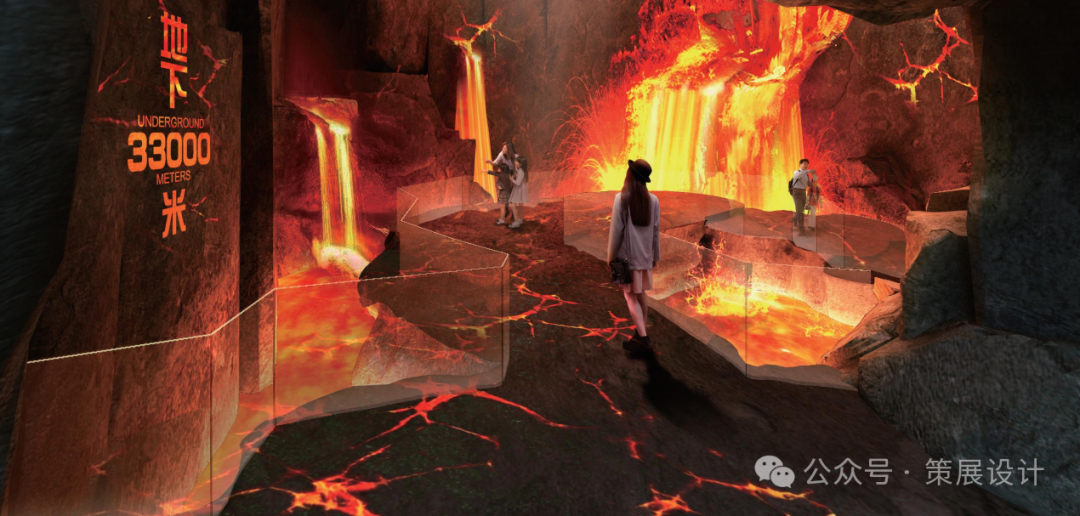 作为将游客引入深海的世界观的主入口,通过仿真岩石和水流作为设计要素。利用扬声器将清脆的水流声扩大,增强感官体验。防腐木甲板,衬托出宛如在海边港口般的氛围。并在瀑布周边布置一些树木来提升空间的带入感。墙壁以及天花采用镜面,通过反射来增加景深,让观众进入一个不可思议的世界。穿过瀑布后光线变暗,周边泛出星星点点的亮光,营造神秘感。