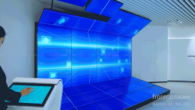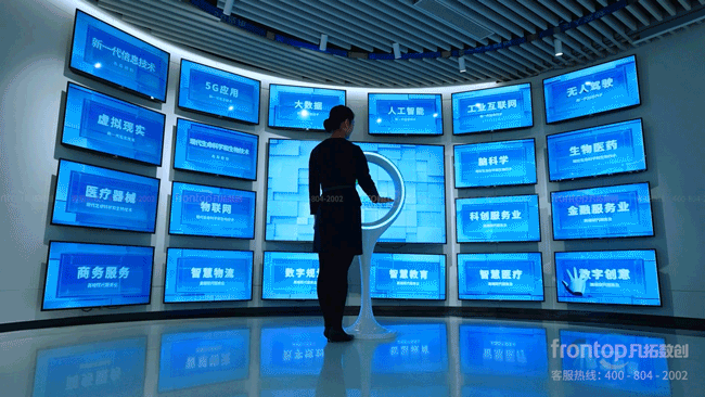 设计具有强交互的飞屏系统,将大数据、人工智能、虚拟现实、数字创意等前沿产业的政策支持及发展情况等内容以动态、全面的方式悉数呈现。