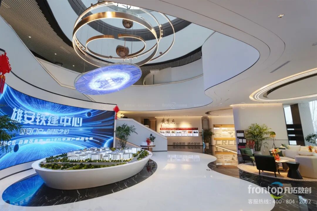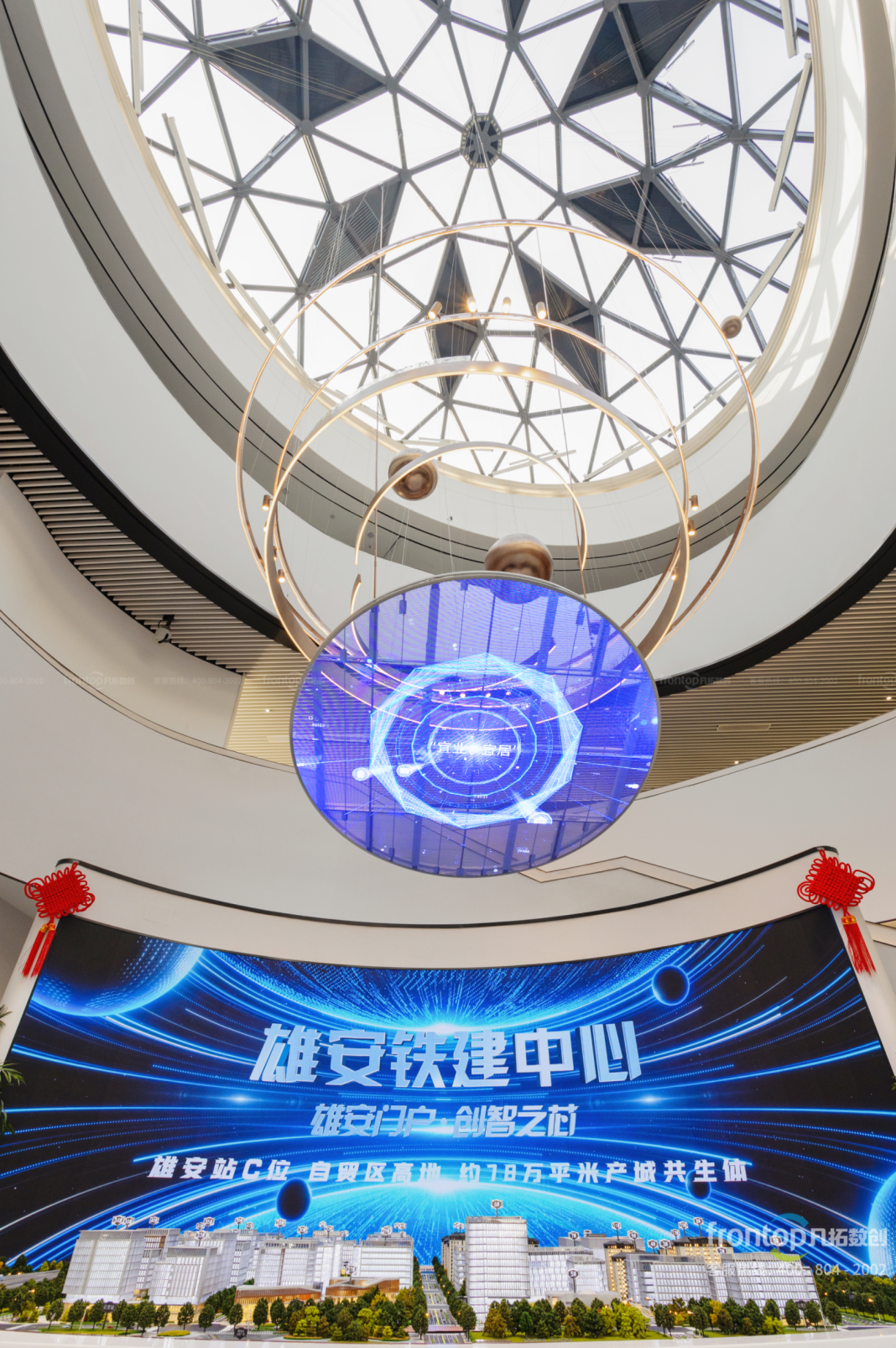 三层挑空的艺术装置组合作为整个空间的流线核心和视觉主体,全面展示雄安铁建中心项目总体规划、区位优势、交通配套,赋予世界TOD门户样板发展前景更开阔的尺度。
