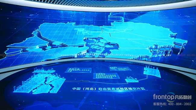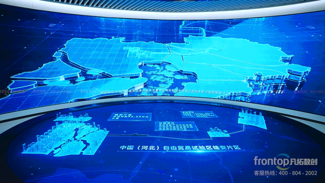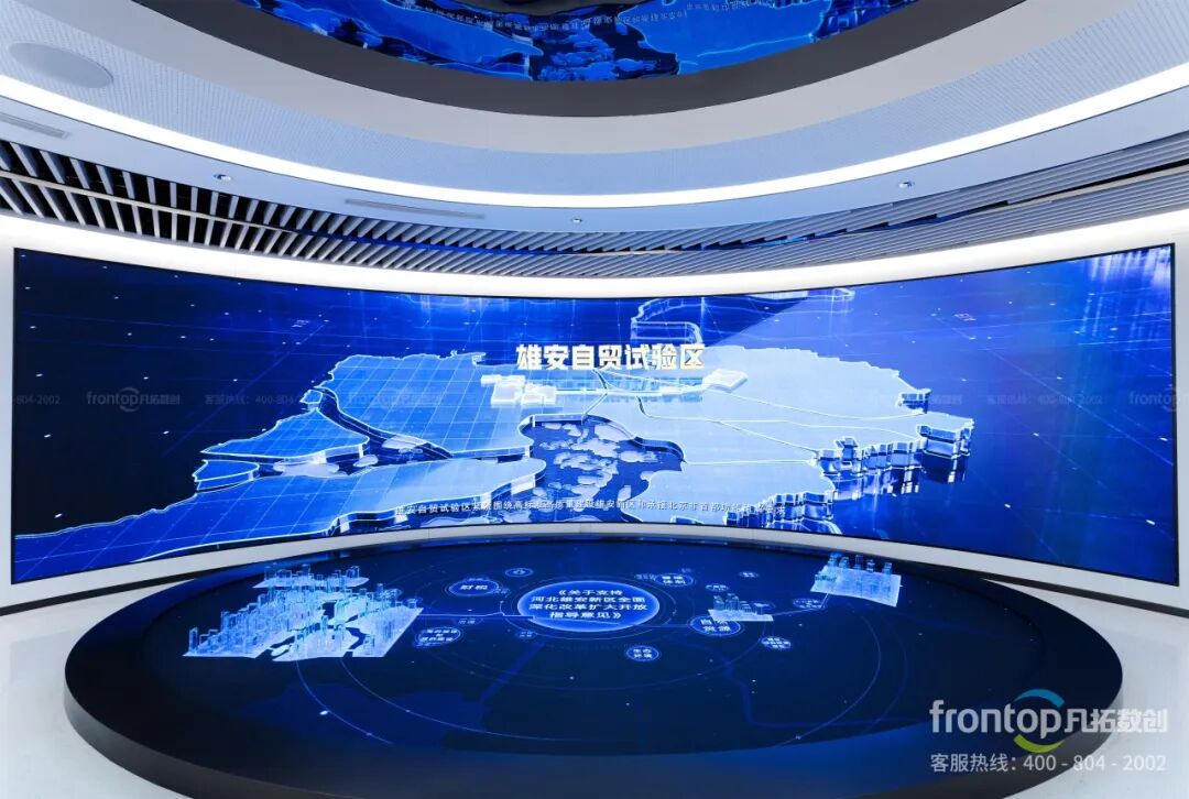以创新新高地为设计理念,打造雄安自贸区的规划展示高地。立足当下,展望未来,双屏联动展示雄安自贸区总体规划、交通优势、空间布局、产业发展规划等建设情况。