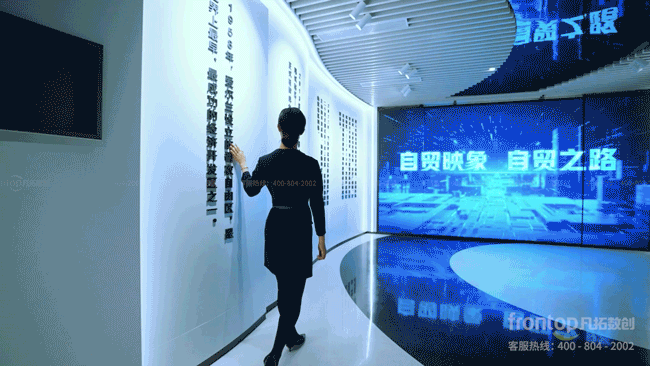 影片结束后机械屏向后滑动,时空穿梭的影像氛围,引导参观者走进自贸之门,以全球视角看中国自贸发展更迭。