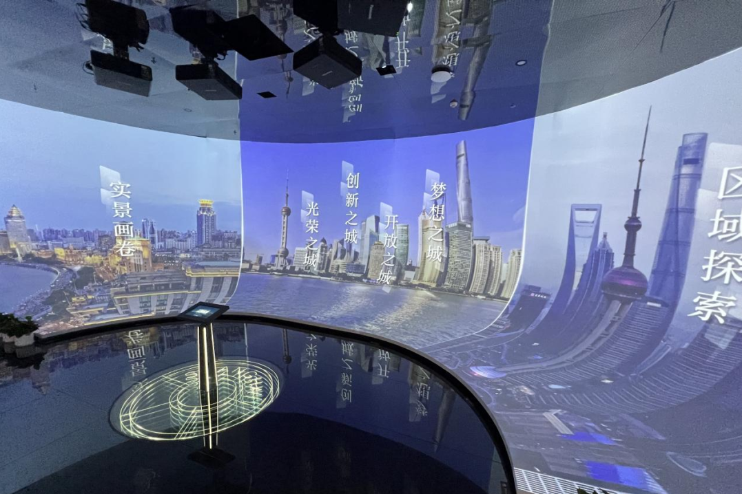 二楼的 杨浦区城市规划展示馆,以杨浦丰富的历史底蕴和创新发展实践为脉络,通过 巨幅高清三折LED屏幕、多媒体互动、AR智能交互和实体虚拟交互的全景模型,全方位展示杨浦历史底蕴、规划蓝图、城区发展建设成就和未来发展愿景。