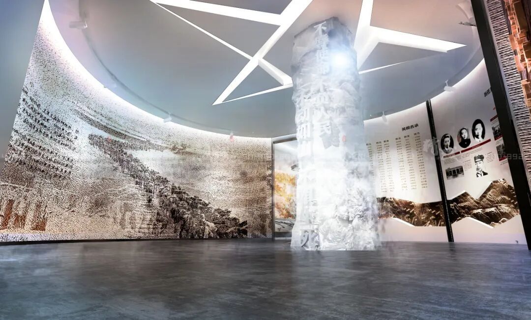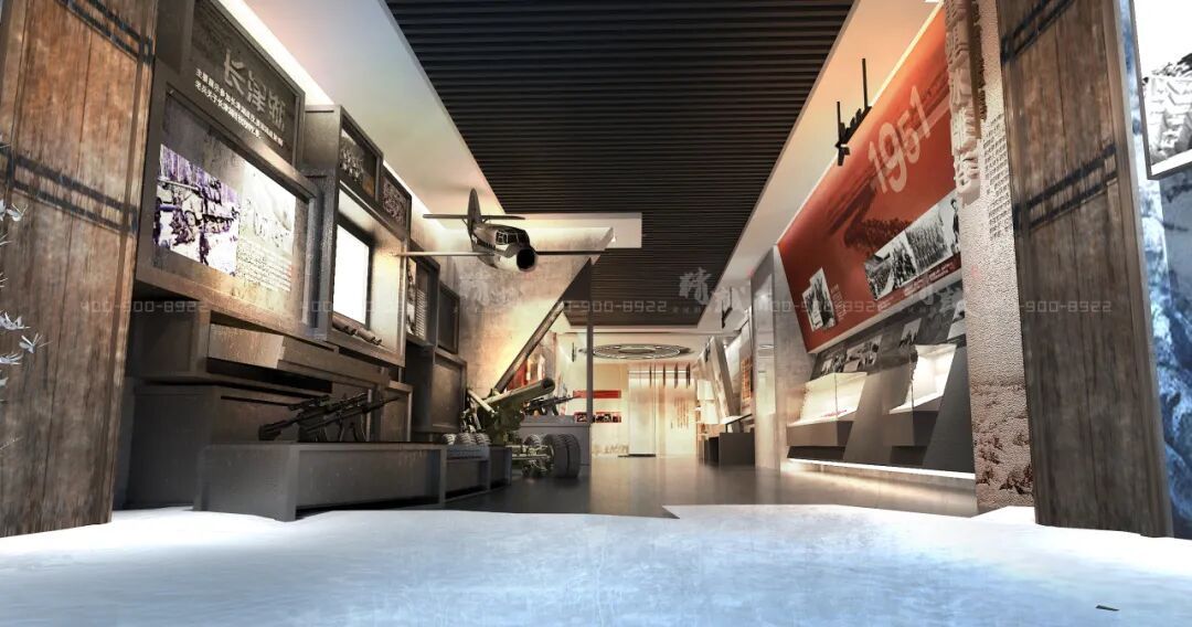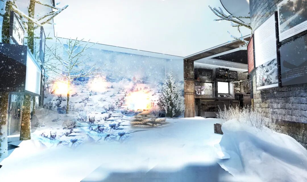 展馆整体设计大气肃穆,通过丰富的文物、照片以及场景复原等方式展现了中国人民志愿军抗美援朝第2次战役整体态势,连队入朝参战准备情况及参战物品,同时辅以志愿军战歌背景音乐等。沉浸式场景介绍长津湖战役鏖战死鹰岭战斗画面,场面恢弘悲壮,采用全息3D造景+沉浸式投影+场景演绎,打造一个冰雕连军魂感人再现。