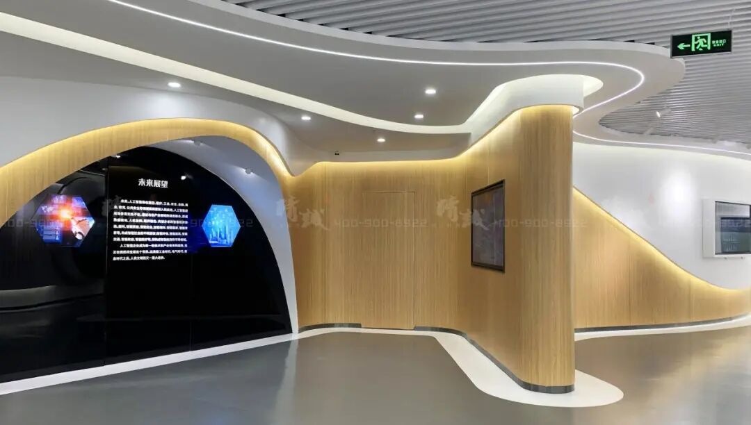 序厅以简约的设计语言和流线造型构筑而成,形象墙上醒目位置以立体字附着习近平主席关于人工智能未来发展的论述。