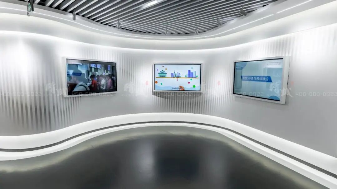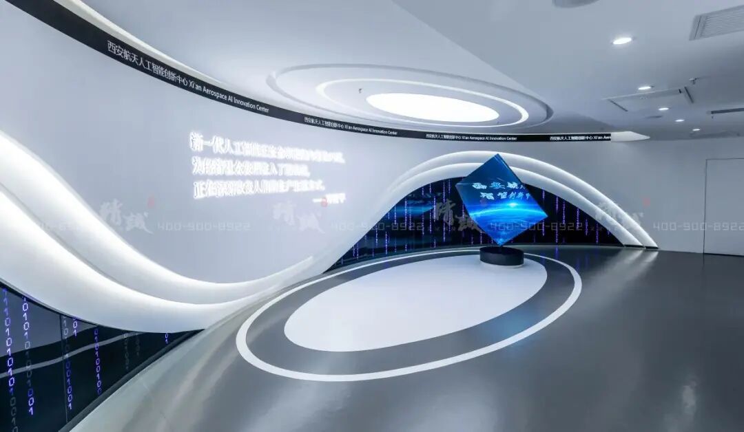 穿过序厅,步入航天基地版块。该区域的延续序厅简约流线造型的同时,着重突出航天基地属性特色。作为科技创新培育的沃土,运用投影技术展示航天基地人工智能发展的丰硕成果、未来展望及智创西安城市的大蓝海战略。