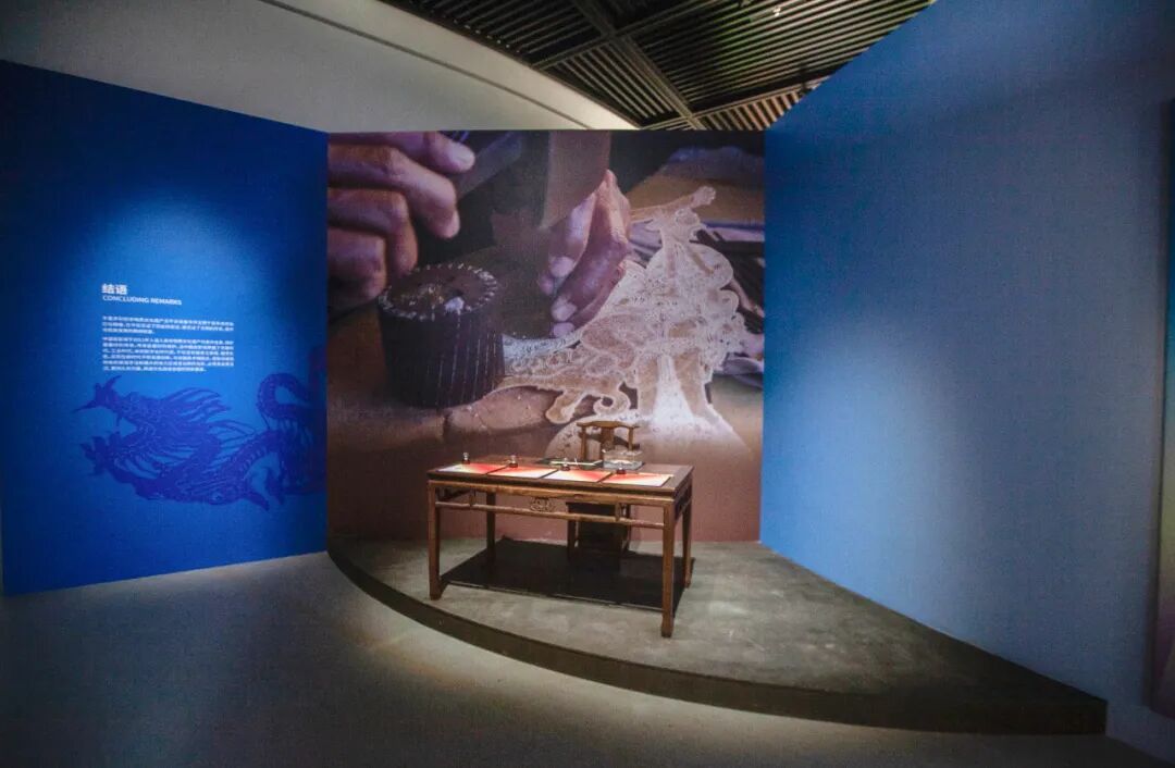 尾厅处,我们打造了一个廊道,辅以皮影中的剪影元素,与序厅形成呼应,带来完整的参观体验。并且在结尾处设置了两个皮影戏台,观众可以在此体验皮影戏的表演。