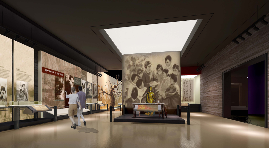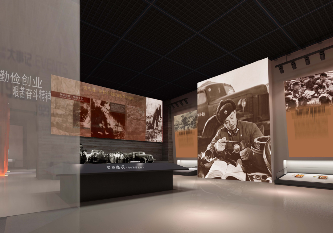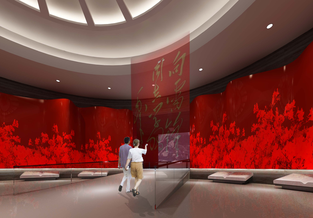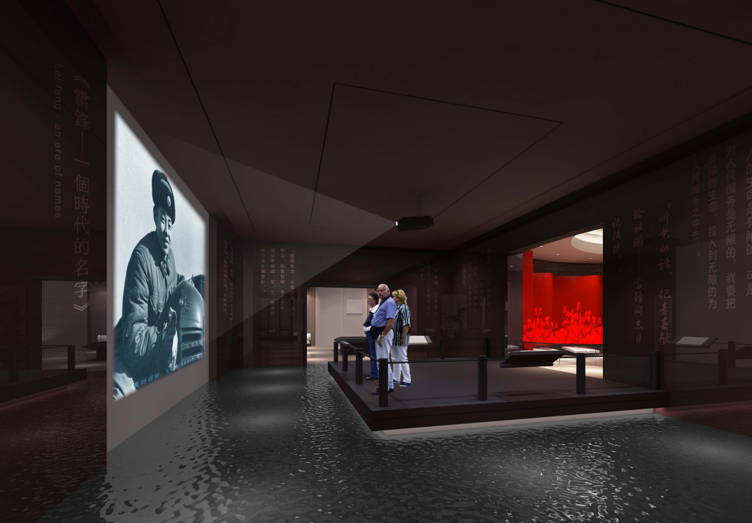 首先,基于拓展序厅物理空间的思路,我们将序厅设计成圆形,强烈的向心性形成第一感官上的视觉冲击力。背景墙面上以大型大型背景画:映山红作为开篇序曲,主题墙制作成思红旗如绸带的造型,向展厅中部汇集,其上漫山遍野的映山红,富有动感的宏大的画面构成了革命的浪漫主义的视觉张力,展厅正中是雕塑:雷锋标准像,前言刻在雕塑前放的卧碑上,后方是纱幕投影展标:向雷锋同志学习,其后更可隐约看到投影:《雷锋一个时代的名字》,四周的画面下方是雷锋日记的精选展示。伴随着背景音乐《唱支山歌给党听》,整体环境以多层次,写实与写意交织融合的创作笔法概念性的升华主题内容,从内向外,层层递进的诠释展览的情感内涵,既贴近了主题又扩大了序厅作为展览总括的核心意义。