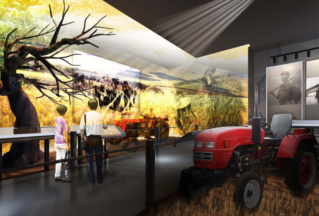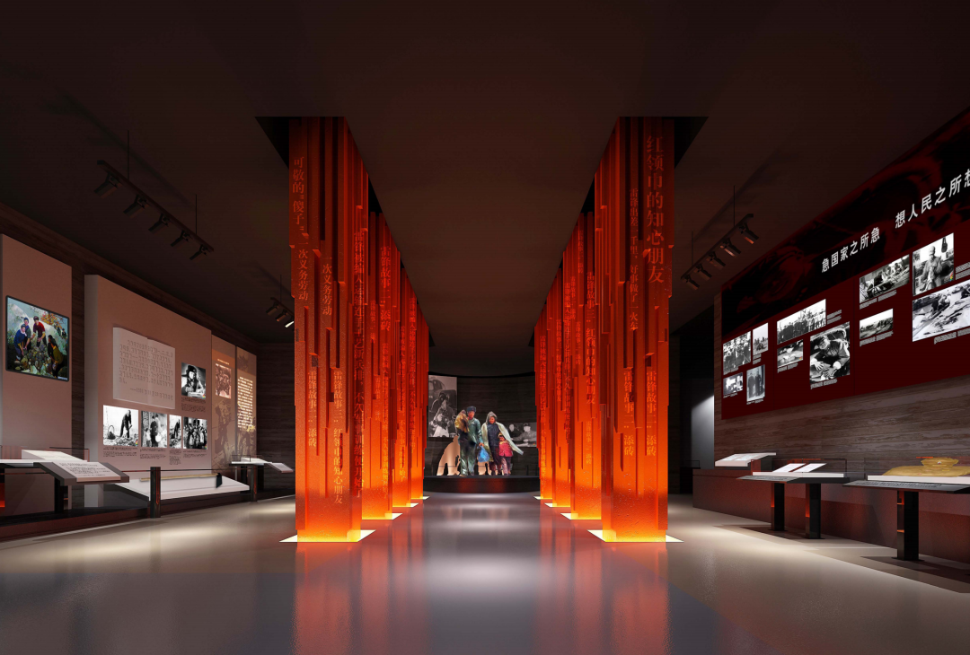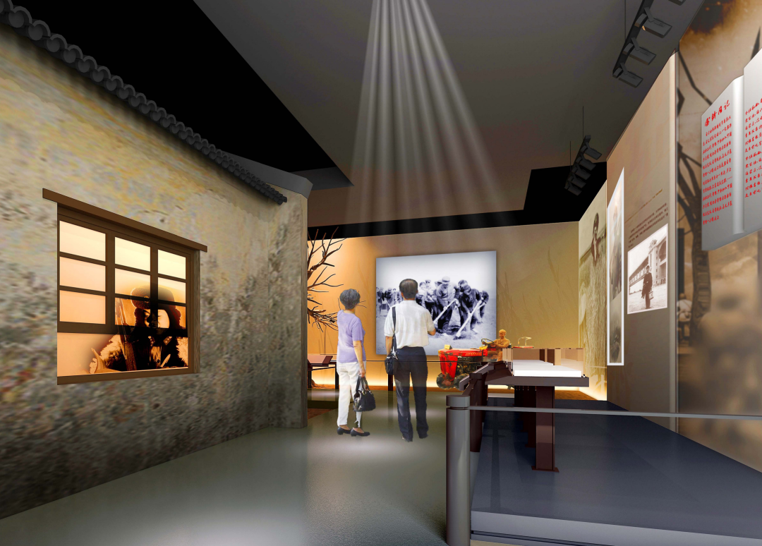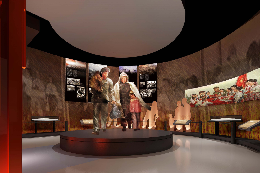 首先,基于拓展序厅物理空间的思路,我们将序厅设计成圆形,强烈的向心性形成第一感官上的视觉冲击力。背景墙面上以大型大型背景画:映山红作为开篇序曲,主题墙制作成思红旗如绸带的造型,向展厅中部汇集,其上漫山遍野的映山红,富有动感的宏大的画面构成了革命的浪漫主义的视觉张力,展厅正中是雕塑:雷锋标准像,前言刻在雕塑前放的卧碑上,后方是纱幕投影展标:向雷锋同志学习,其后更可隐约看到投影:《雷锋一个时代的名字》,四周的画面下方是雷锋日记的精选展示。伴随着背景音乐《唱支山歌给党听》,整体环境以多层次,写实与写意交织融合的创作笔法概念性的升华主题内容,从内向外,层层递进的诠释展览的情感内涵,既贴近了主题又扩大了序厅作为展览总括的核心意义。