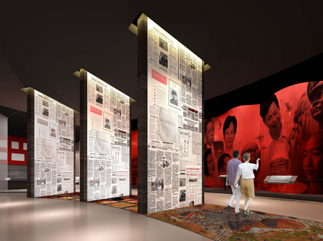 此展区,我们力图营造一种热烈、隽永的精神感及展望感。三面“报纸墙”有是多年来各种对雷锋事迹的报道,这些报道几乎影响我们现在的每一个人。地上的动漫地图:青年志愿者在新疆、青海、西藏211个全国重点扶贫县工作分布图,表现了在榜样的影响下,贫困地区的孩子们的成长经历中留下了无数个“第一次”他们中的很多人也将成为未来的“雷锋”。