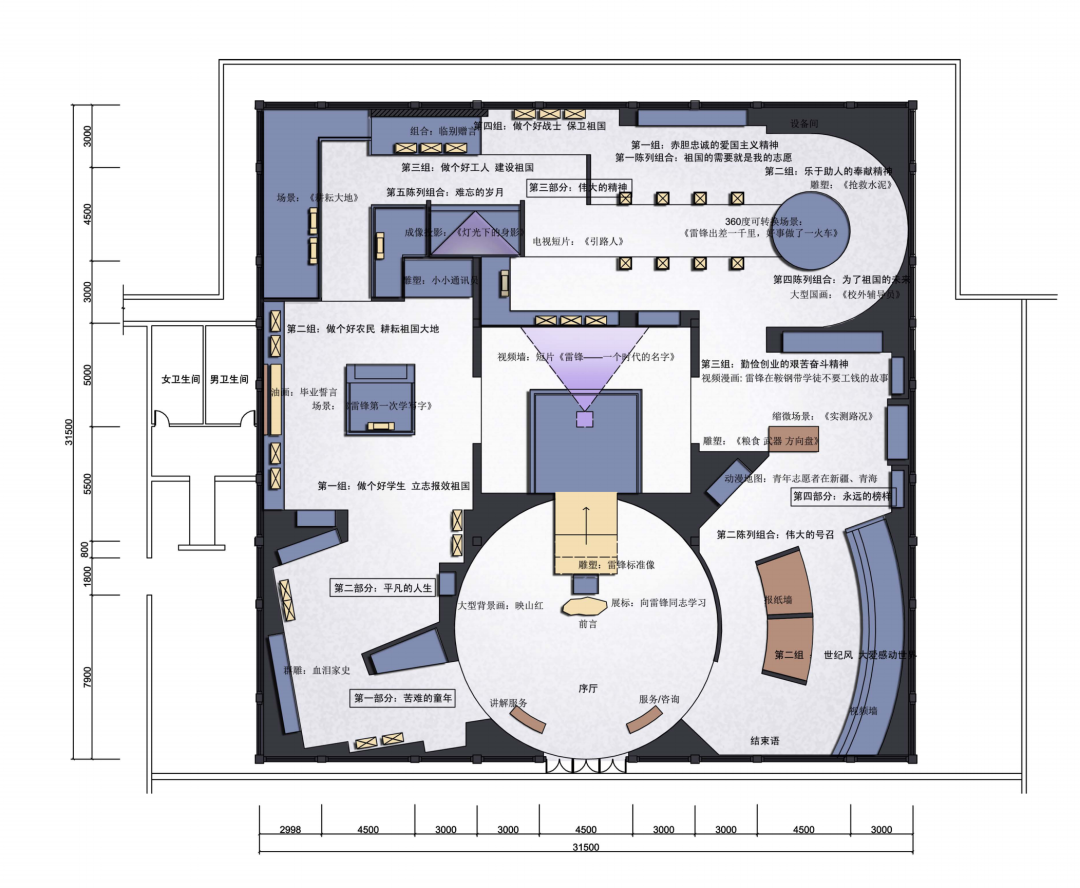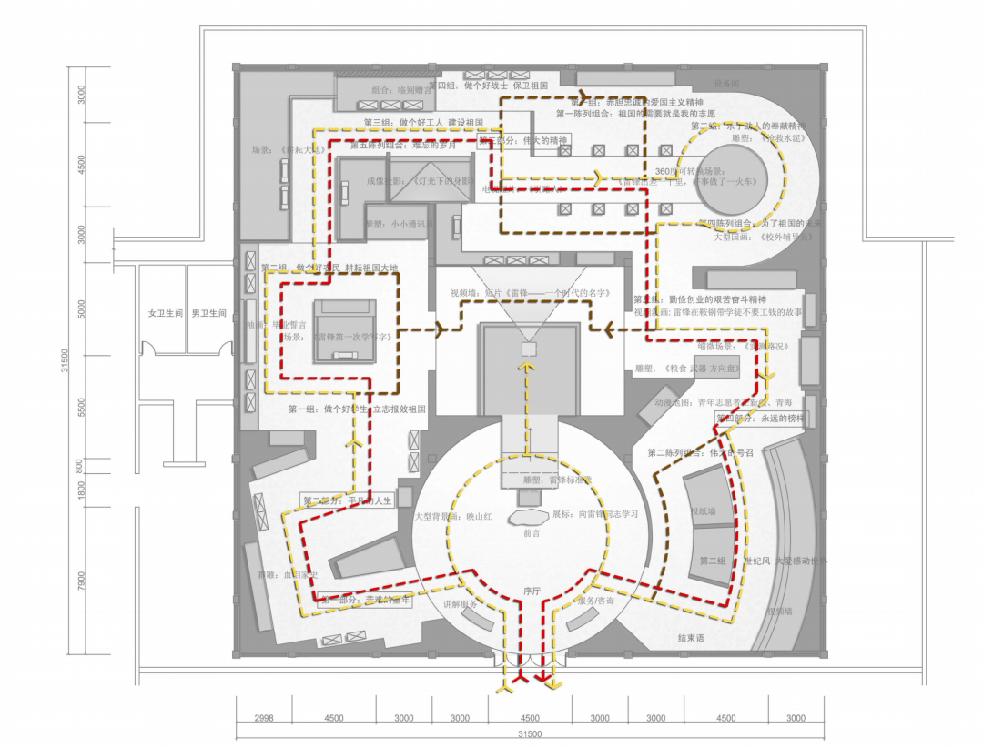 本次展览共划分为六大部分:序厅、放映厅:《雷锋-一个时代的名字》、第一部分:苦难的童年、第二部分:平凡的人生、第三部分:伟大的精神、第四部分:永远的榜样。在参观的动线上,利用建筑的特点我们考虑了不同人群需要作出相应的参观流线分析。在第二部分的开始处与第三部分的结尾处通过放映区相连接,让展览的流线更加多变,通畅,放映区的高差设计分流了来自序厅和来自展厅的观众,使得动线虽灵活,但对参观的引导仍然井然有序。