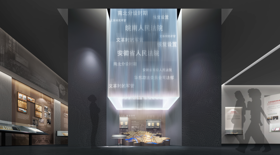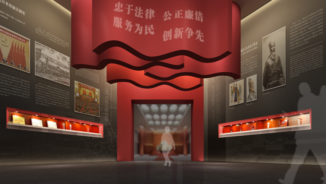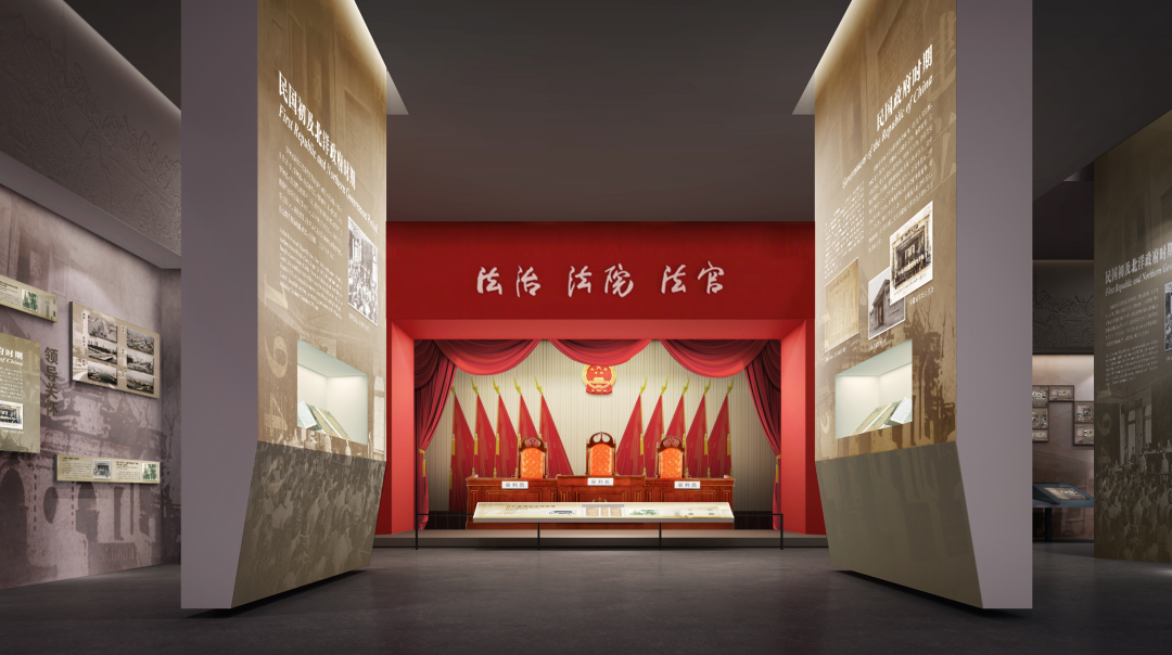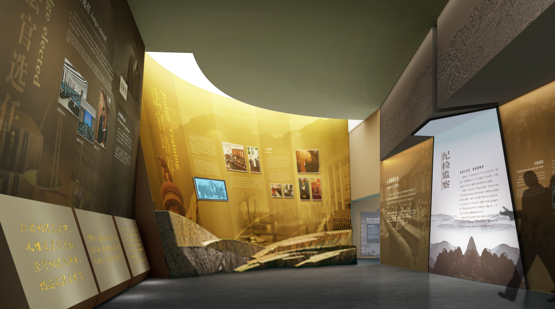 法院是司法系统的重要直属机构。在本展区的设计中,在尊重原有建筑前提下,变弊为利,在展区正前方设计法院审判庭的场景复原,对称的展柜布局形式,渲染了宏大、庄重的法制气氛,点明了展示主题。并通过多媒体投影播放审判现场的视频资料,给人以身临其境的感觉。
