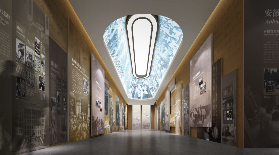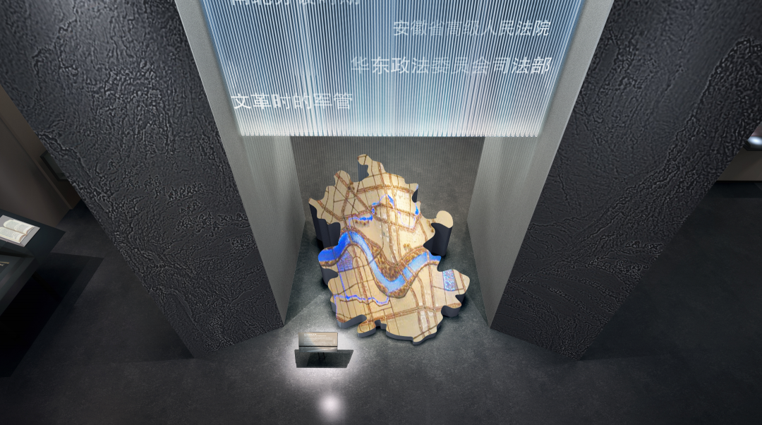 法院文化建设这一空间进深较长,因此,在空间的限定因素上我们将空间分为上下两部分,以打破空间的狭长感。书信手稿墙面设计将内容加以提炼,与顶面的氛围营造相呼应。