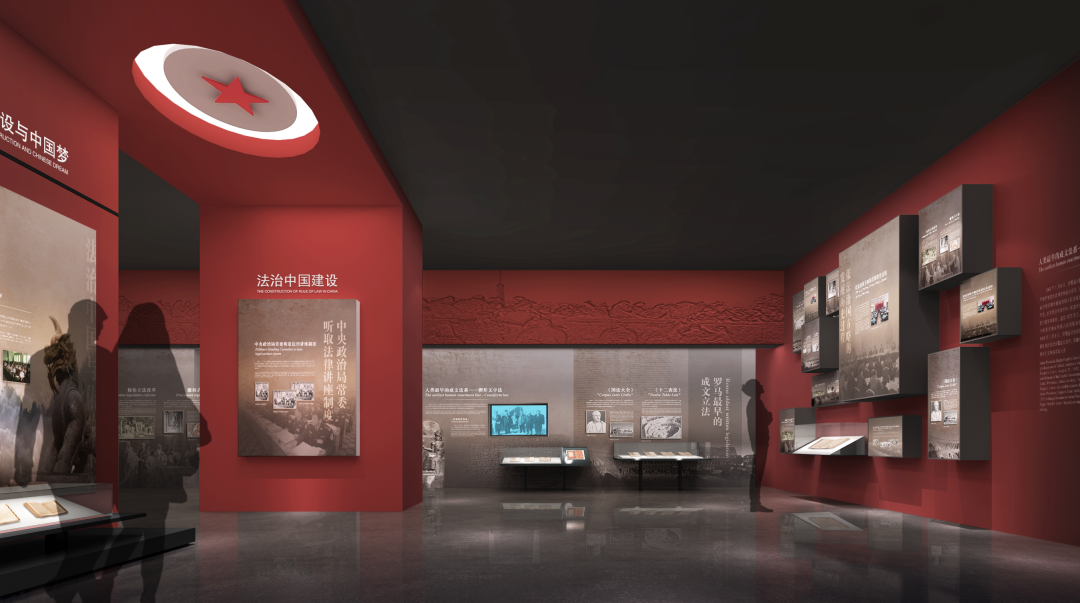 序厅是整个展览的开篇,是展览内容的高度集中概括,序厅设计在创造意境、烘托主题、感染参观者情绪中起“点睛”的作用。在序厅设计中,我们紧密切合展览主题,以中国红为色彩基调,采用中轴对称布局。四根红色柱子以“中流砥柱”的设计寓意凸显法制的重要性;正前方的红旗抽象造型极富动感,对称布局又带来稳重、庄严之感;法制基石由三块国徽砌成,寓意法制是记载历史的根基,人类文明正是建筑在这些厚重的文明历史之上,进而点明展览主题。序厅的地面以时间轴的形式设计,显示中国法制文化的发展历程,结合朱红色色调,营造了法制文化威仪、神圣庄重的展览氛围。