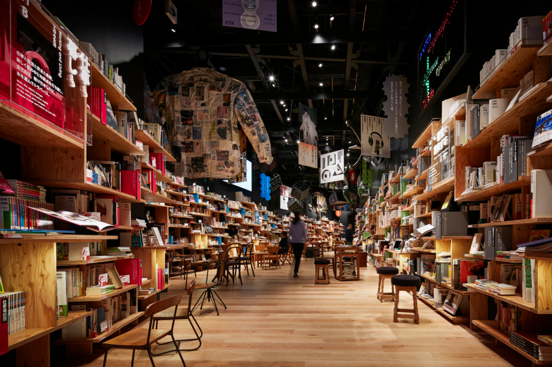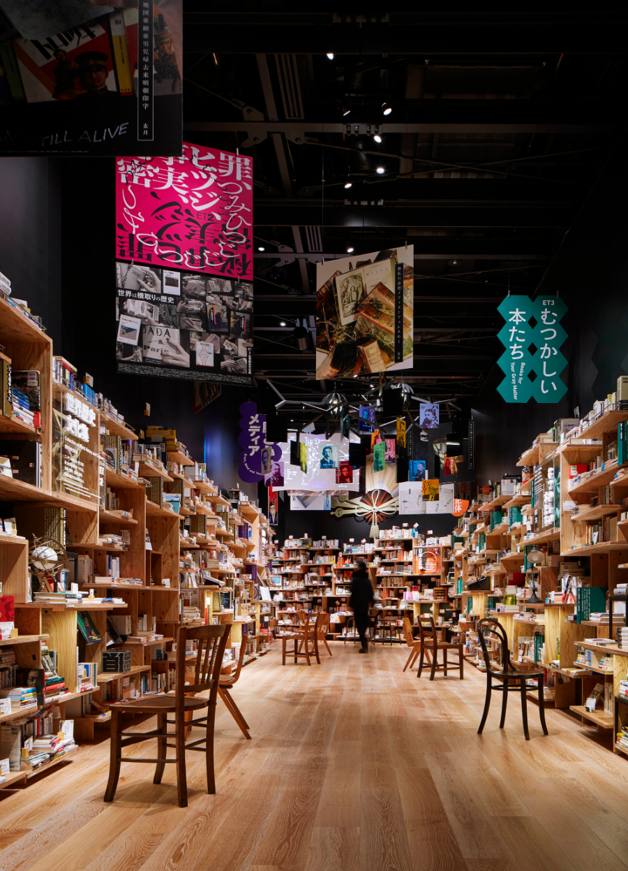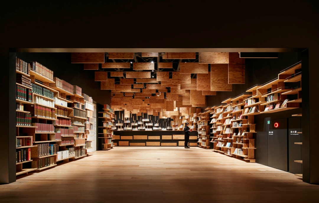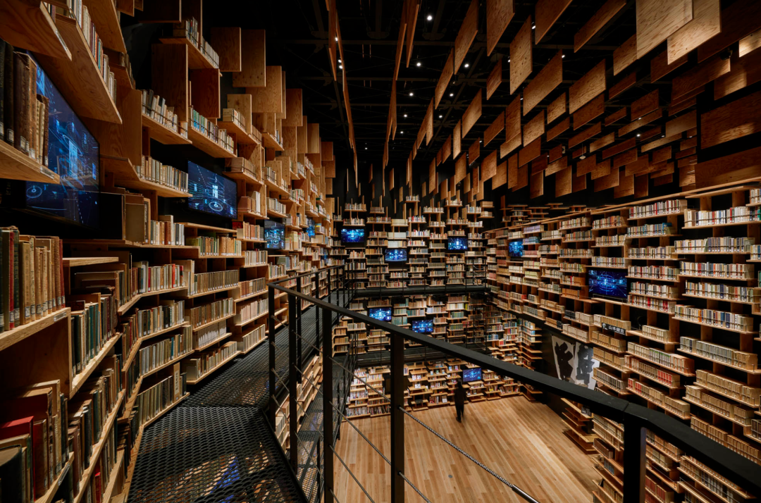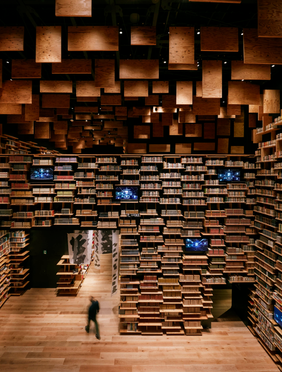 The interior is intentionally chaotic, featuring high culture such as contemporary art, low culture such as anime, white and black spaces, and real and fake exhibits. The space is unified by adjusting the grain of materials such as cedar plywood, cypress, and stainless steel mesh.