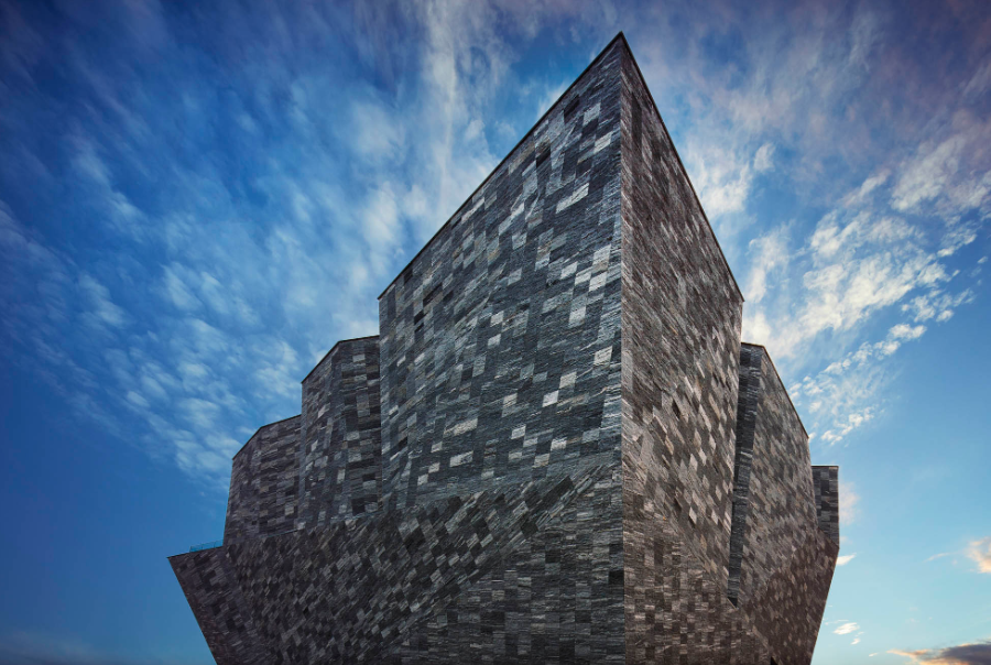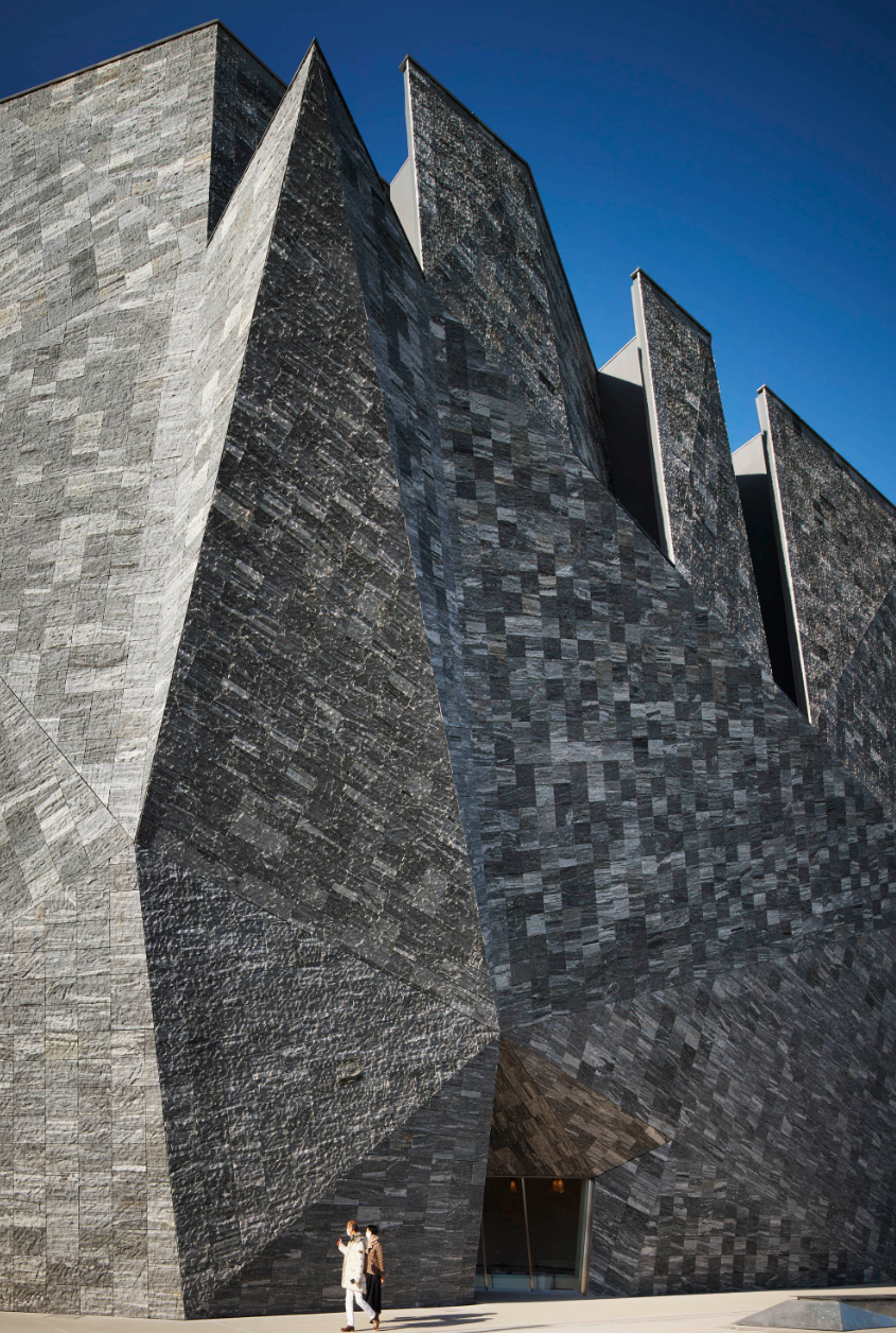 覆盖外墙的2万块花岗岩被命名为“黑色幻想”,开采于中国。其特点是在黑色基底上呈现强烈的白点起伏。设计采用70毫米厚石块敲凿出的粗糙纹理,并在石块接缝处刻意不对齐台阶,形成自然与人工共存的颗粒感。