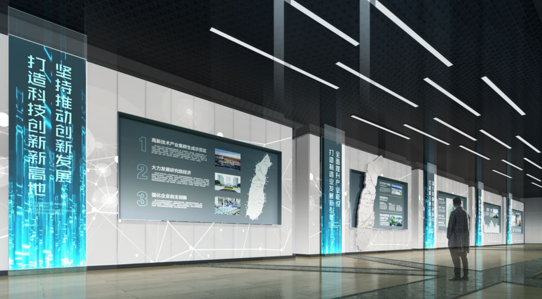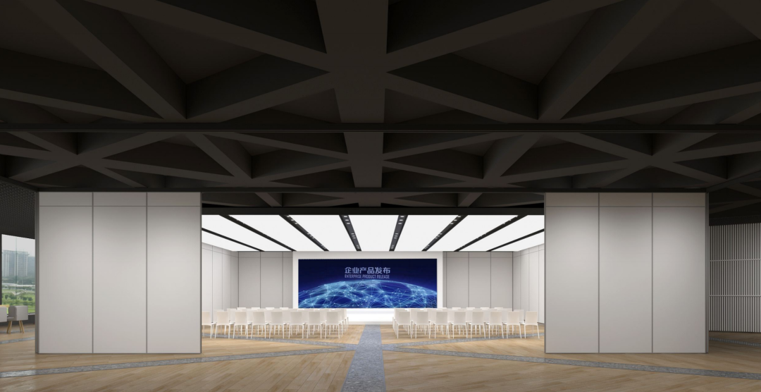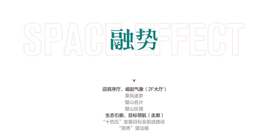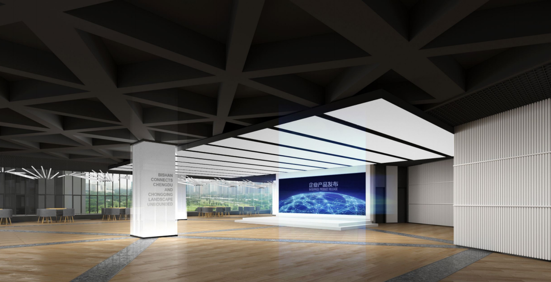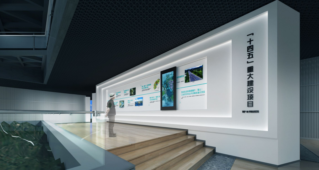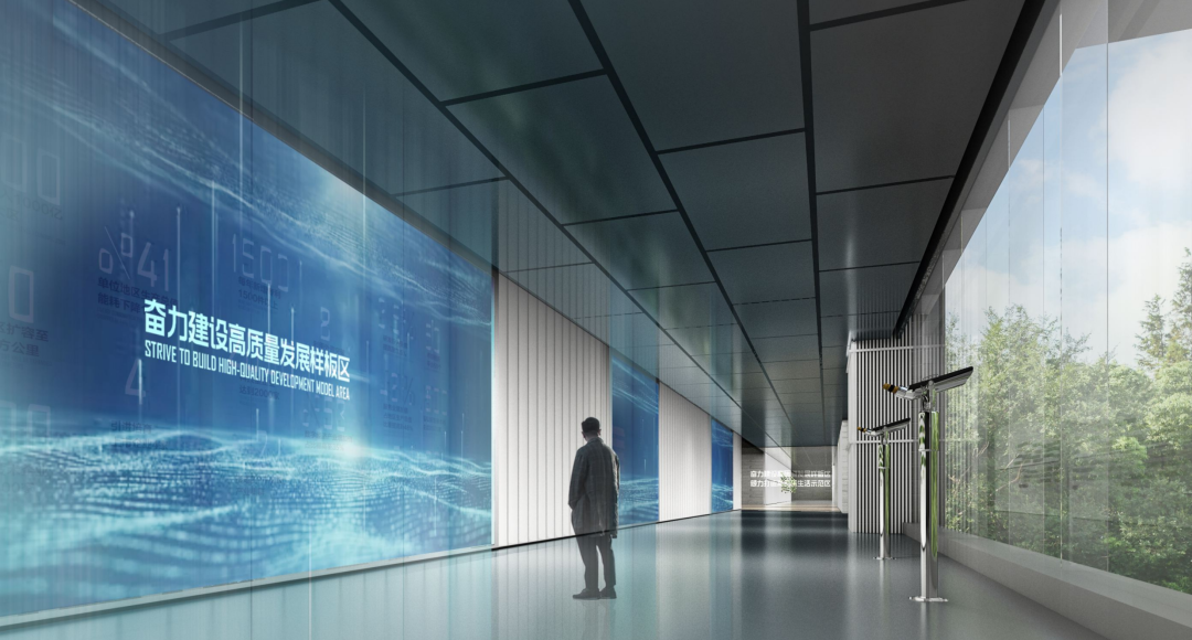 在设计之初,秉持着尊重原有建筑结构的原则,我们对序厅空间实施了适度改造。为充分彰显璧山“未来之城”的科技感,同时强化序厅的视觉冲击力与仪式感,我们沿着L形的吊顶,精心设置了LED大屏。当人们步入序厅,便能直观感受到扑面而来的科技魅力。
