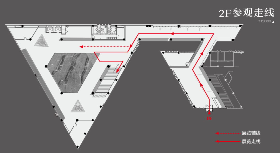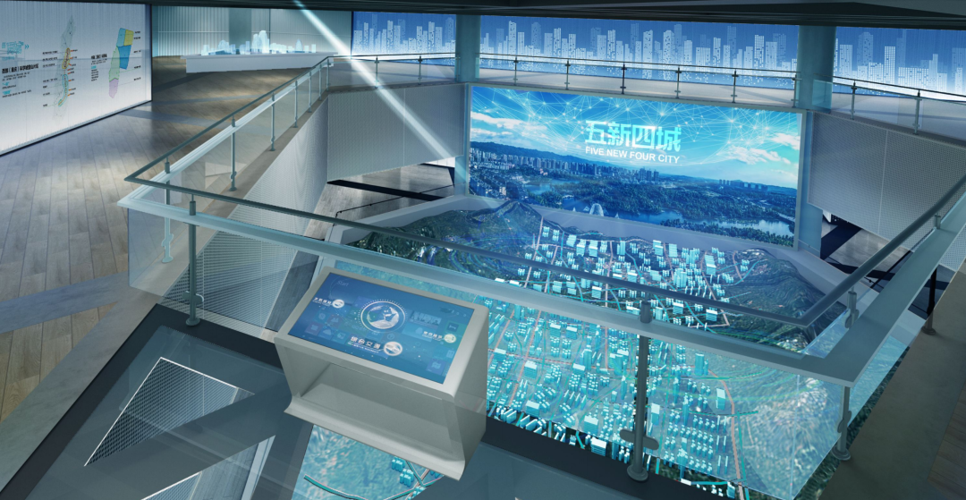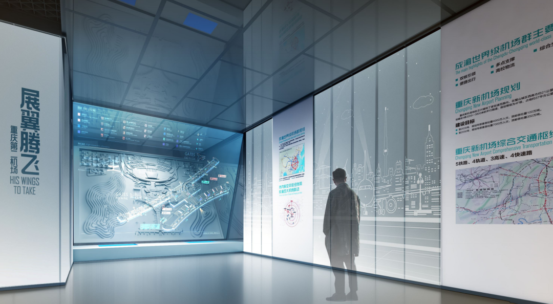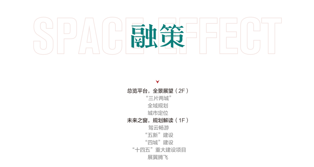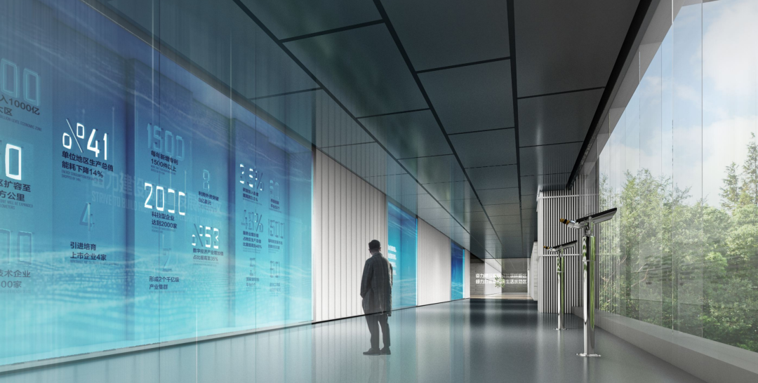 在设计之初,秉持着尊重原有建筑结构的原则,我们对序厅空间实施了适度改造。为充分彰显璧山“未来之城”的科技感,同时强化序厅的视觉冲击力与仪式感,我们沿着L形的吊顶,精心设置了LED大屏。当人们步入序厅,便能直观感受到扑面而来的科技魅力。