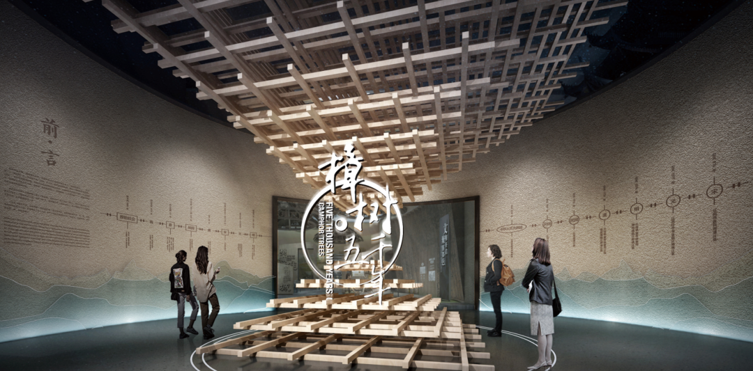 弧形展厅起到自然分流的作用,中间聚焦樟树五千年的历史定位。顶部与地面以木龙骨搭建,犹如拔地而起的繁茂樟树,象征樟树文明的生长与繁盛。四周以富有层次的山川围合,营造“千里河山聚名城邑”的天人合一之感。