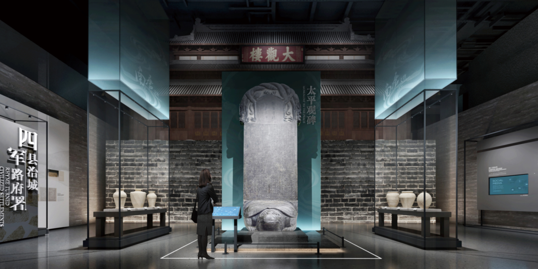 太平观碑是南唐建清江县时所立,是现存唯一的千年古碑,是千年古县的重要历史见证。展陈中采用光导纤维形成帘幕式隔断,将大观楼与太平观碑进行空间分隔,营造层次丰富的历史氛围。穿过大观楼,便进入宋临江军部分,继续讲述樟树的历史发展。