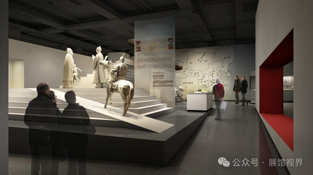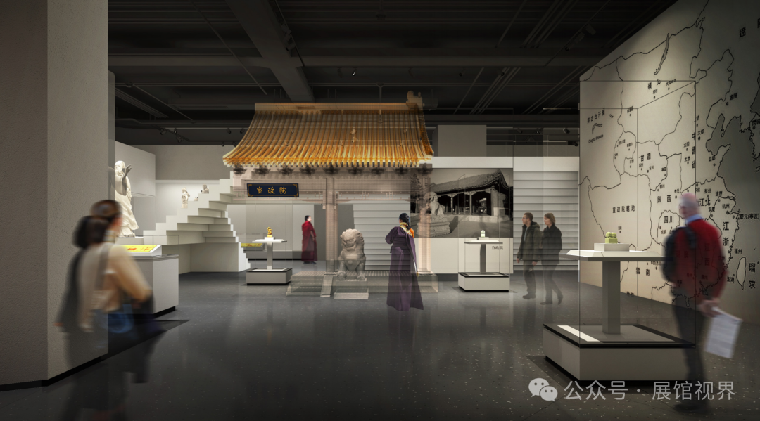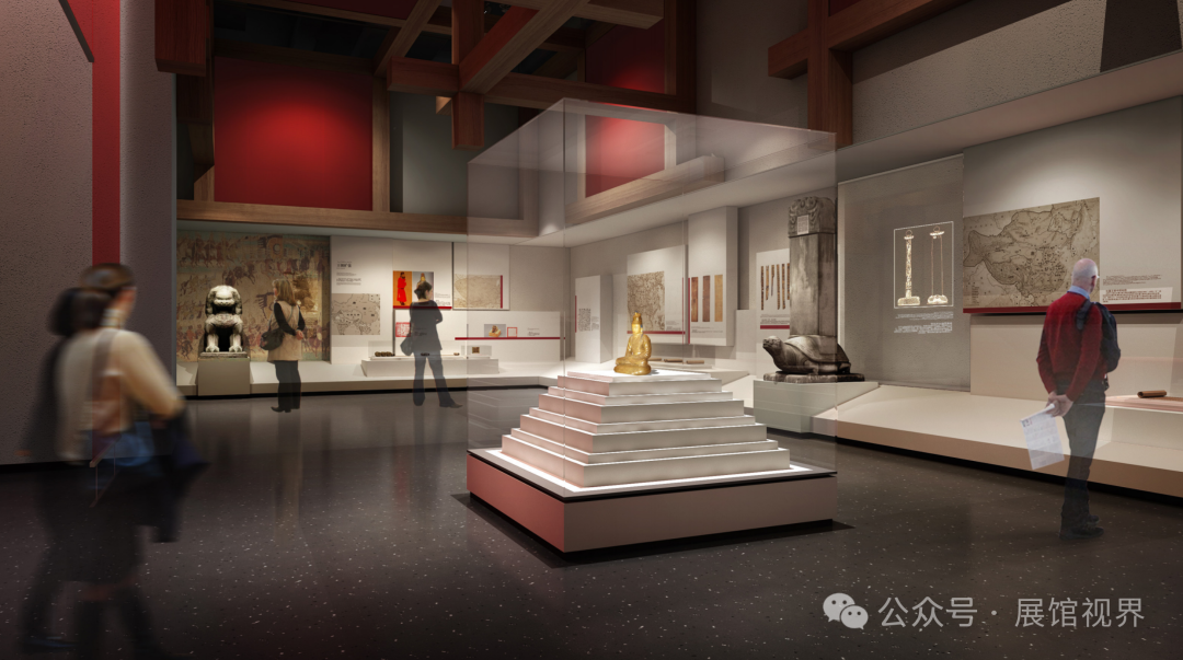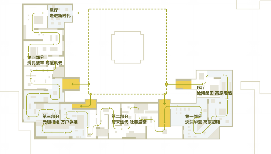 展览六大部分段落既独立分区,又结合建筑疏散条件点位分区对应设置。这些区域既作为展览段落内容有机衔接的转折点,也满足大型展陈开放使用的需求,成为观众驻足休憩的空间缓冲点和配套功能疏散点。