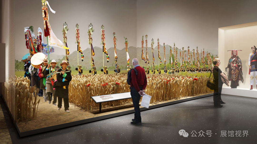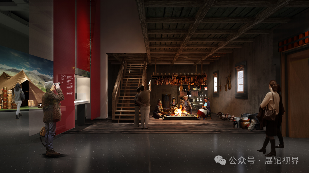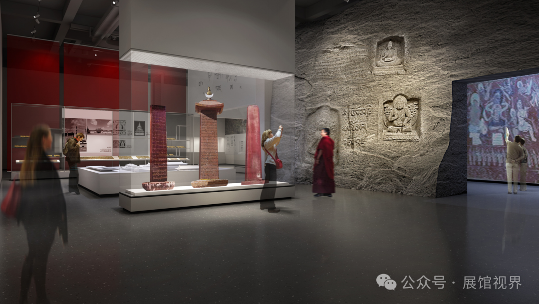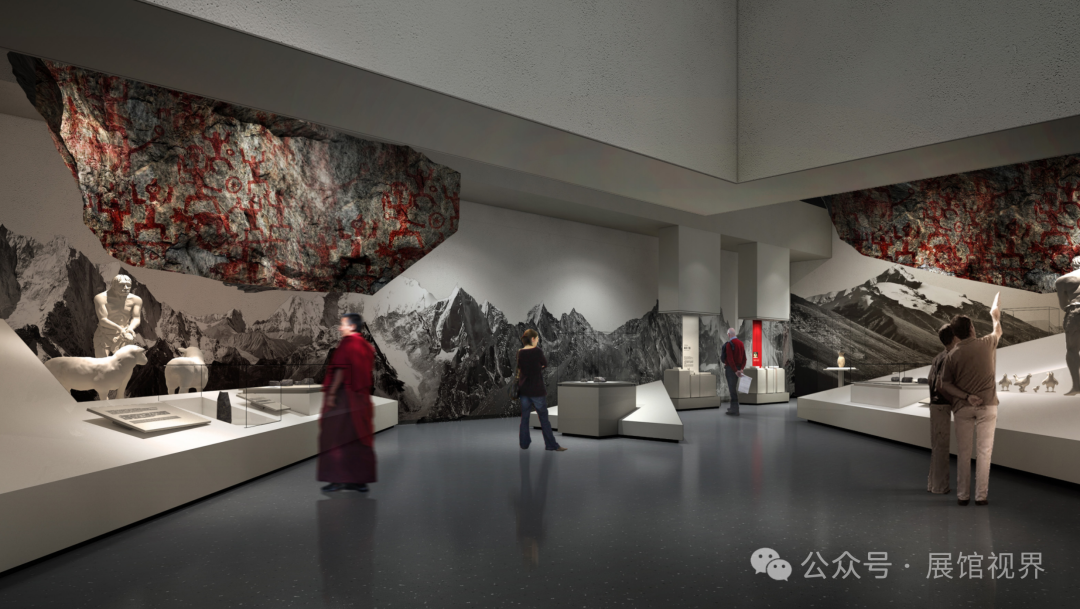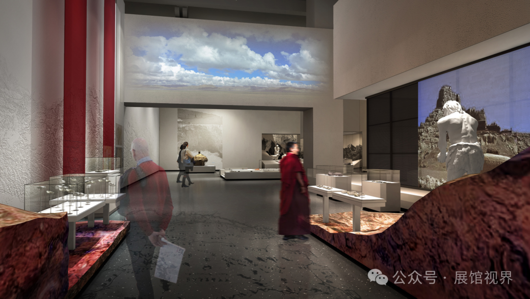 设计中的语言选择与风格营造紧扣陈列主题,同时围绕对西藏文化的表达展开。白色的空间意向象征雪域高原的纯洁与神圣;红色的元素点缀彰显西藏宗教文化的浓郁;开阔的空间尺度表达藏文化所具有的开放与包容;土石肌理的渲染则烘托出西藏特有的地域特色和民族风格。
