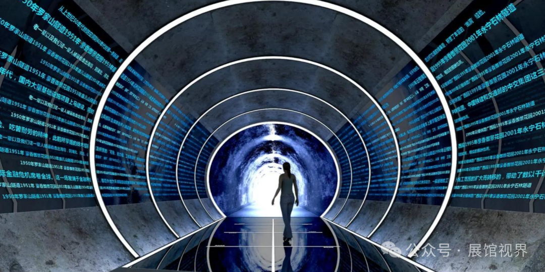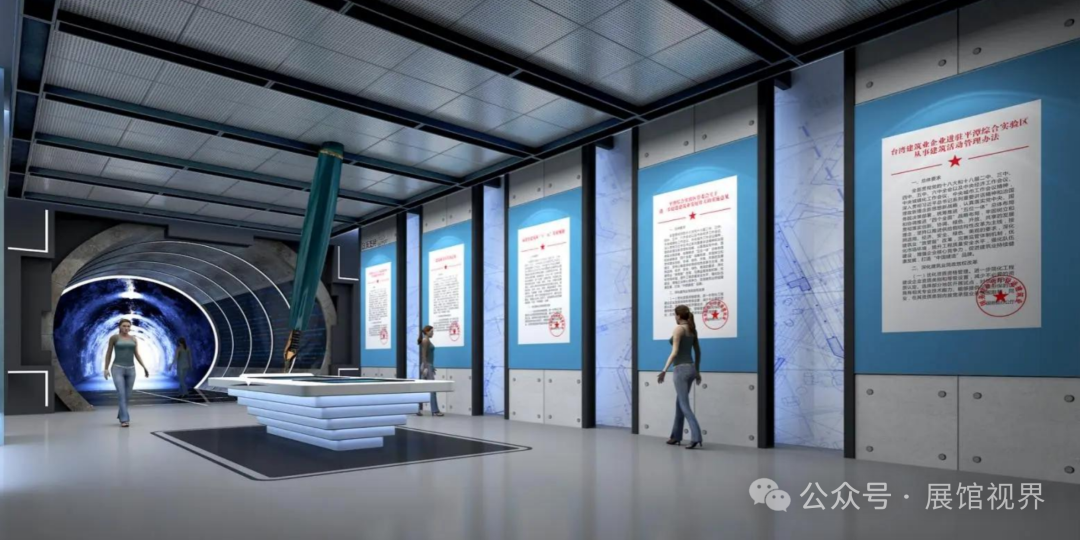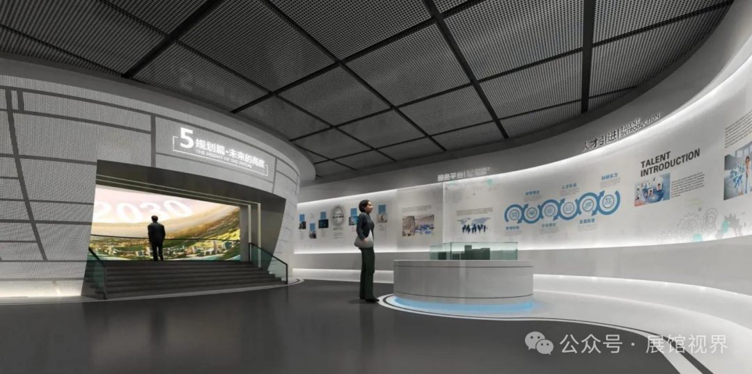 参观动线——穿过大厅,从右侧入口进入,依次参观概况篇、历程篇、转型篇和创新篇等展区后,再进入大堂另一侧观览规划篇及招商篇相关内容。