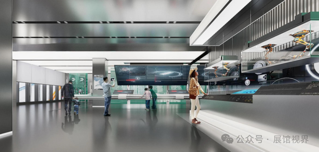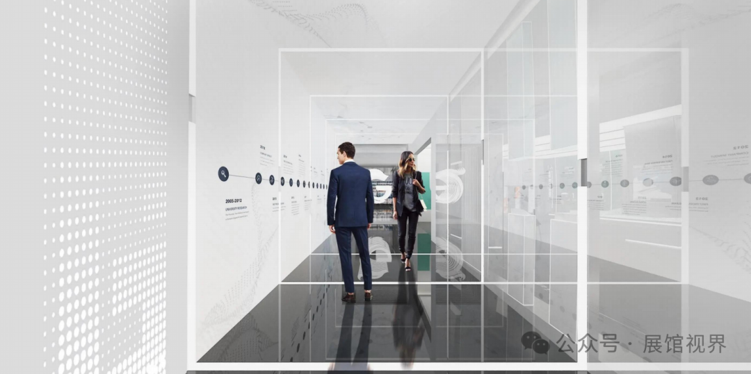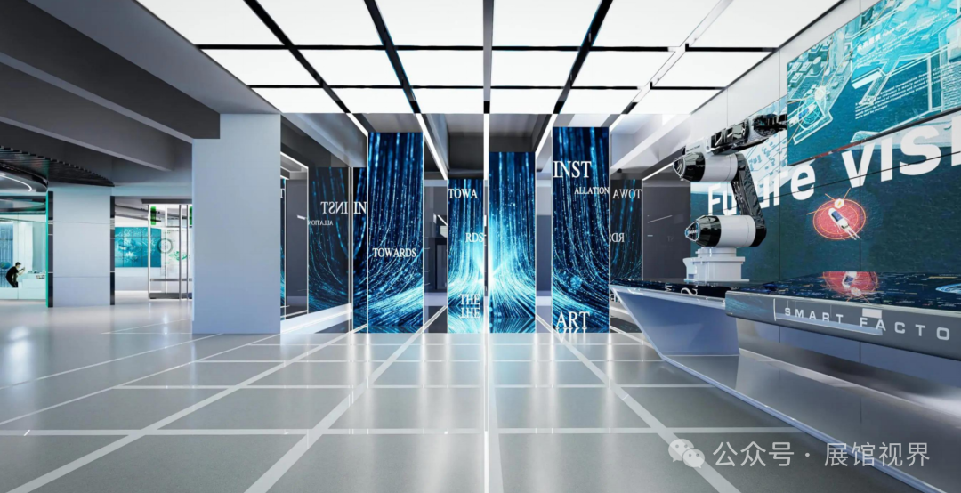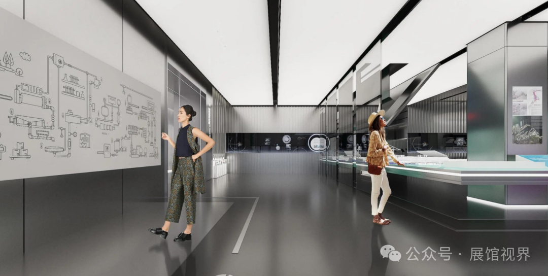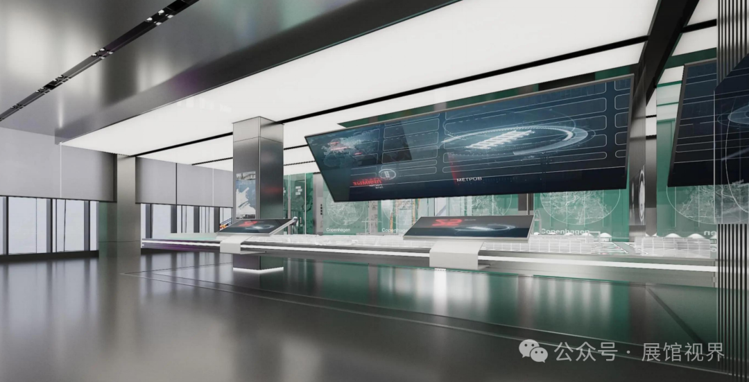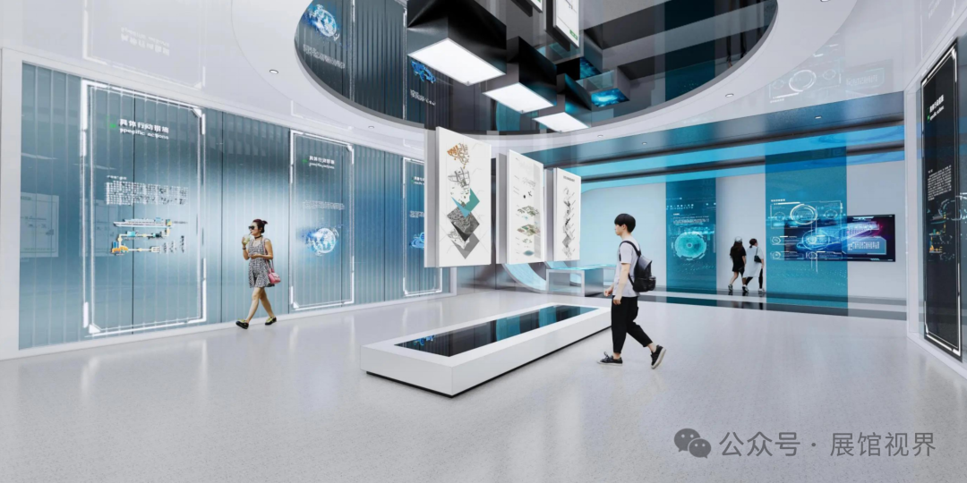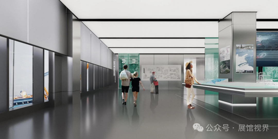 此处以极具科技感的通道作为引导空间,时光通道内的顶面与墙面呈现有关科技重要性和中国重大科研成果的符号及文字,这些符号和文字若隐若现。通道如一束光通向主展区,营造“穿过一条廊,宛转百折时,豁然天地间”的观展感受,带领参观者开启一场有关海港科技的探索之旅。