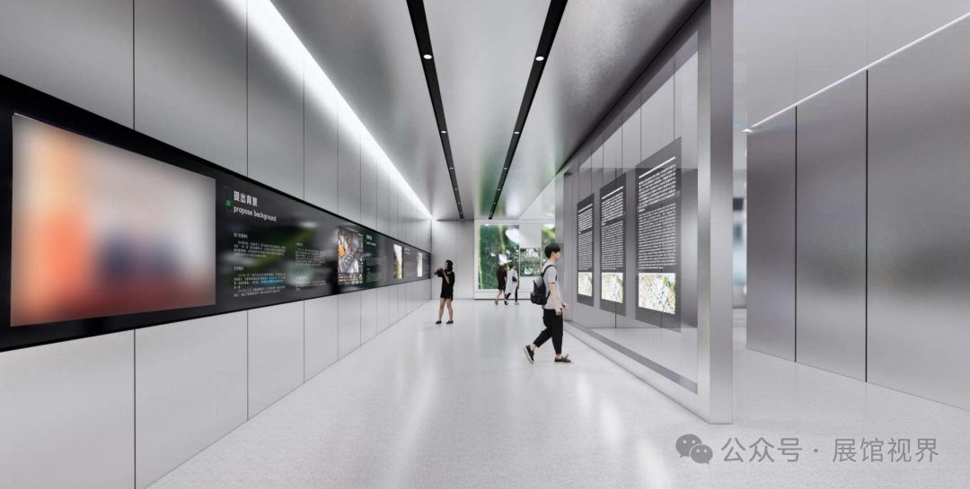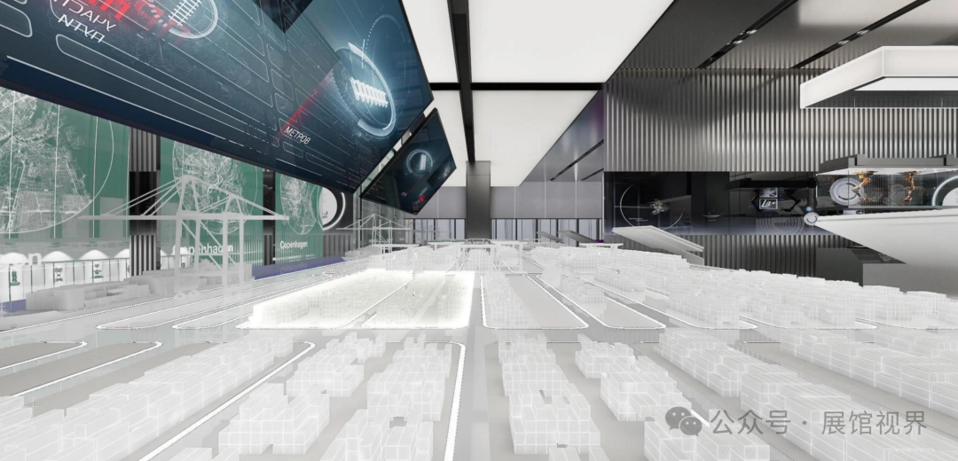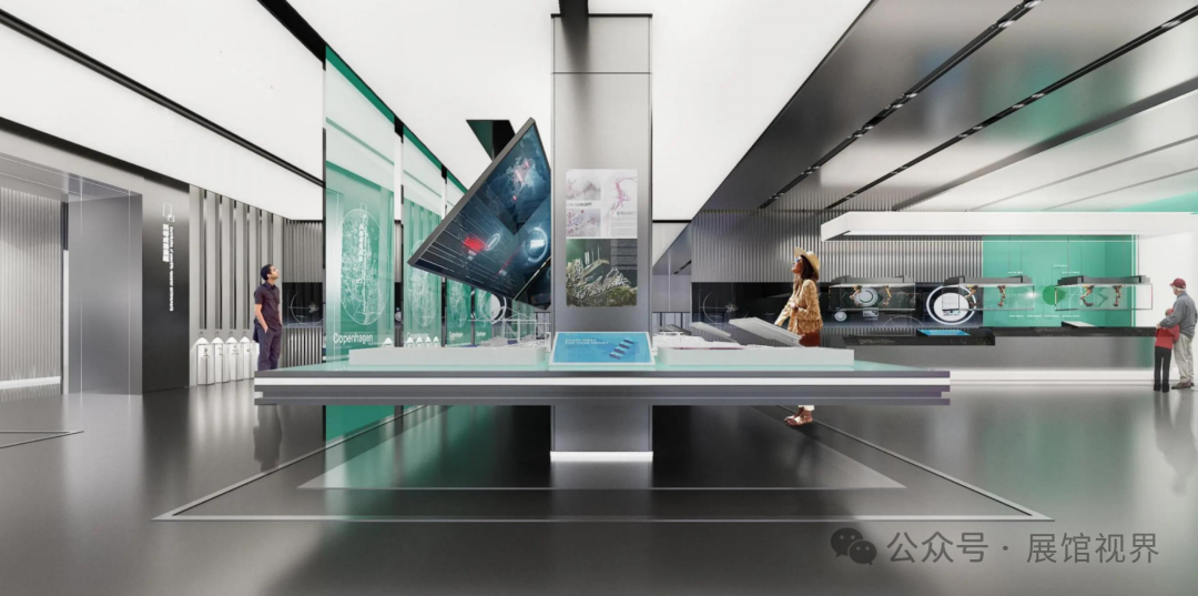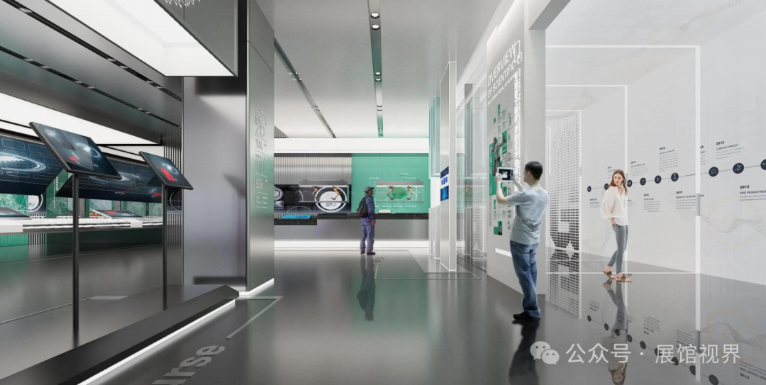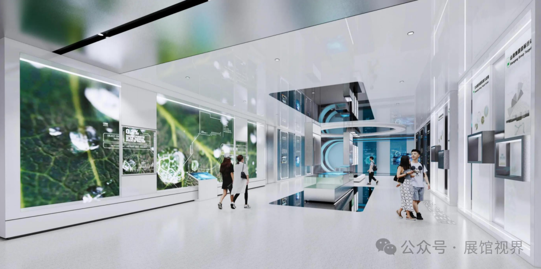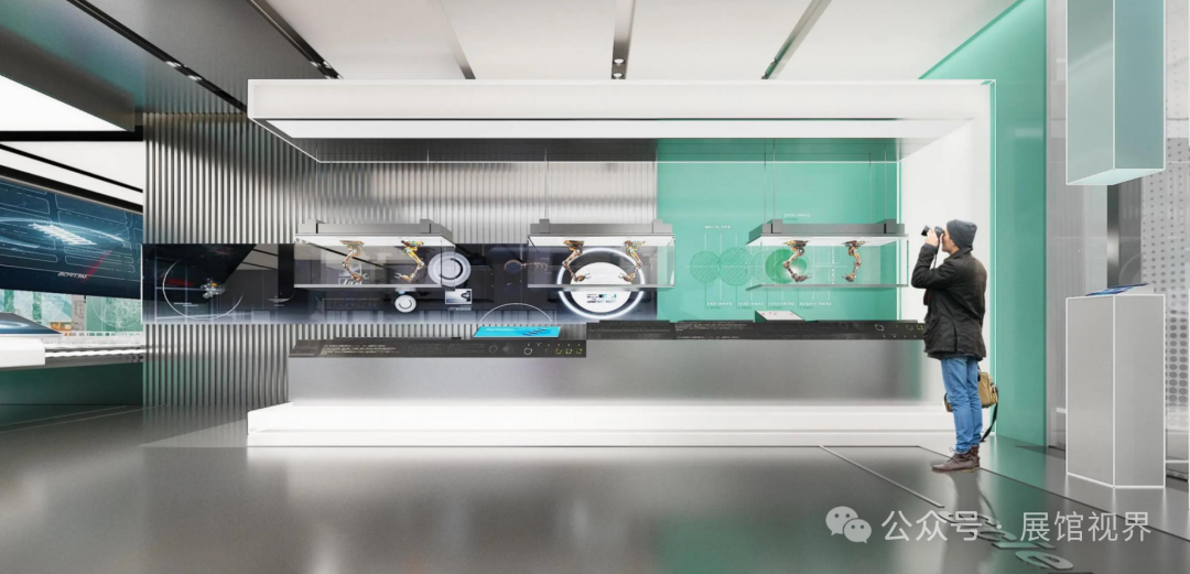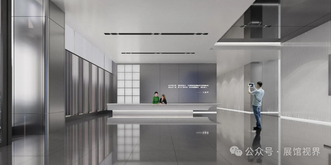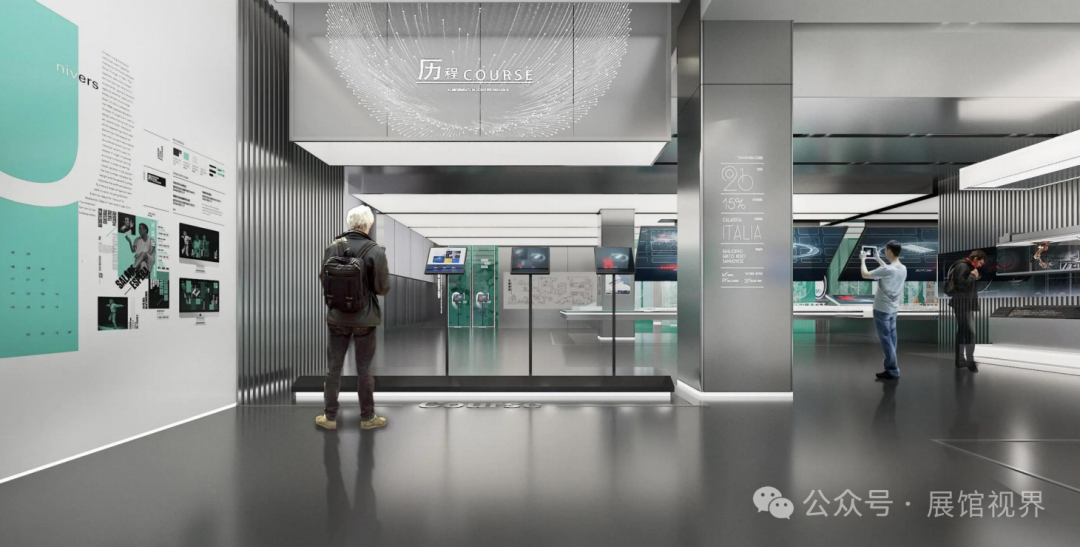 此处以极具科技感的通道作为引导空间,时光通道内的顶面与墙面呈现有关科技重要性和中国重大科研成果的符号及文字,这些符号和文字若隐若现。通道如一束光通向主展区,营造“穿过一条廊,宛转百折时,豁然天地间”的观展感受,带领参观者开启一场有关海港科技的探索之旅。