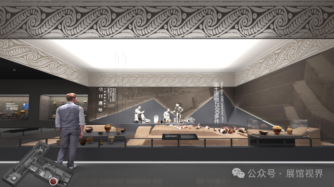 序厅风格简洁明快,墙面利用夯土材质点出展厅主题,地面将考古的探方元素抽象成现代装饰符号。全国重点文物保护单位宗日遗址位于同德县巴沟乡团结村南黄河北岸的二级台地边缘,既有居址又有墓葬。1994年至1996年对该遗址进行了三次发掘,共清理墓葬341座、灰坑18个、祭祀坑18个,收集各种类别遗物三万余件。展厅左侧展柜内陈列考古成果,右侧通过遗址复原讲述遗址的发掘过程。