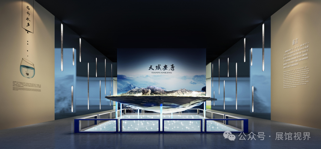 序厅空间设计提取安康"两山夹一川"的地貌特征演绎为空间形态,以写意的氛围形象、趣味的直观展示,呈现山水之间、西部水乡的地域特色,为参观者营造沉浸式的入馆体验,快速带入安康地域文化语境。