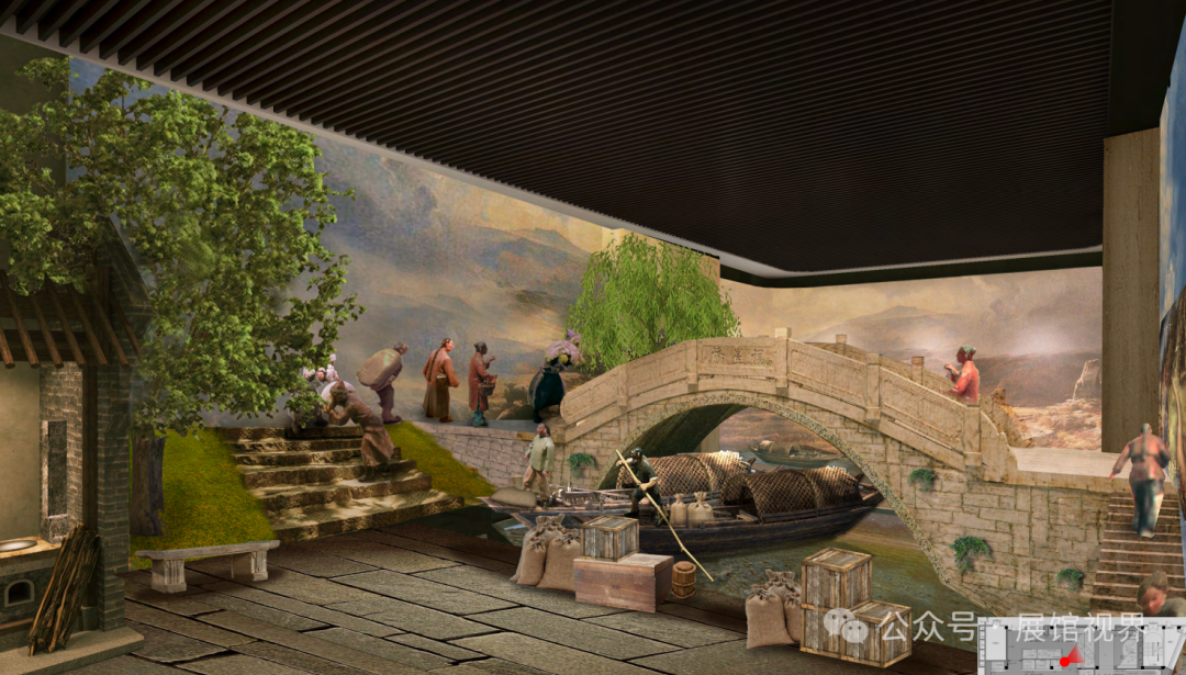 而那忙碌的水埠,更是还原出沿河路廊的热闹场景。瞧,在那忙碌的清晨,河里船只来来往往,一片繁忙。岸边码头上,正稳稳停靠着三五艘带着遮篷的小货船,客商们神色匆匆,有条不紊地指挥着搬运工人装卸货物。再看对面水埠,三两个妇女正蹲在埠头,一边洗衣、洗菜,一边唠着家常,欢声笑语交织在一起,构成了一片热闹祥和的景象,让人身临其境,仿若穿越时空,回到了那个充满烟火气的往昔岁月。