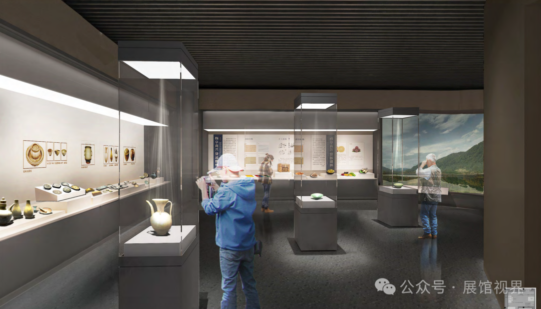在展示区域的空间设计上,借助错落有致的通柜,巧妙融合图文与实物,生动还原了灵山先民的生活场景,恰似一幅徐徐铺展的历史画卷,鲜活展现出新石器时代晚期台州沿海地区人们的日常生活风貌。