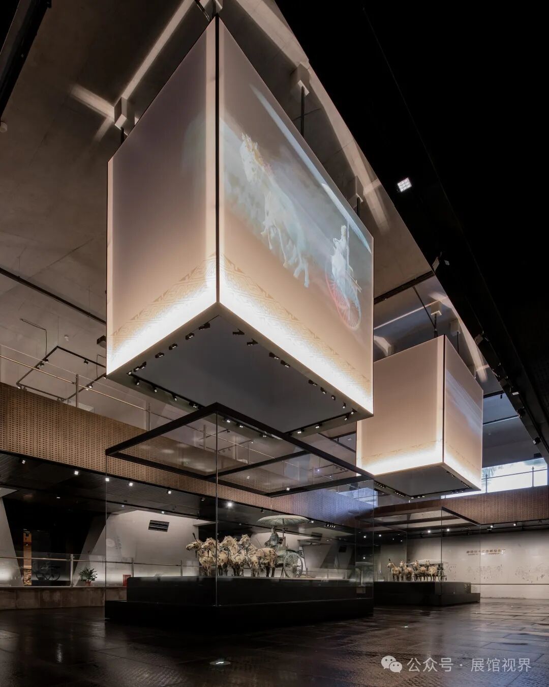 馆内参观路径的组织方式,力图“一步到底,直面真身”。观众从入口一路下行不做停留,经过约200米长的坡道直达中央展厅,在神秘幽暗的环境中能够看到的第一件展品,就是这件特别光照下的“彩绘铜车马”本尊,给参观者以强有力的视觉震撼。
