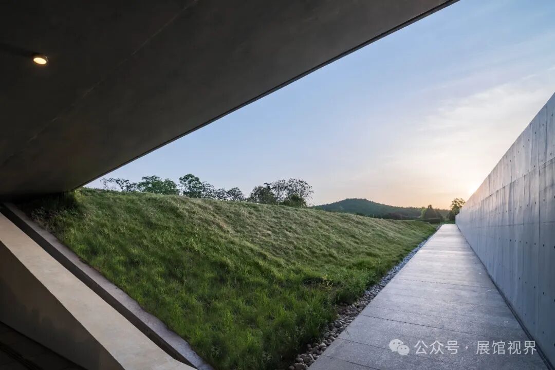 半埋入地下的建筑体量只有两个立面暴露在外,面对着沟底的坎壁。大面积屋顶覆土植草,与周边的陵区环境完全融为一体。这样,在大尺度的景区视距内看不到新建筑,只有参观者近距离置身空间中,才可以触碰到混凝土界面。
