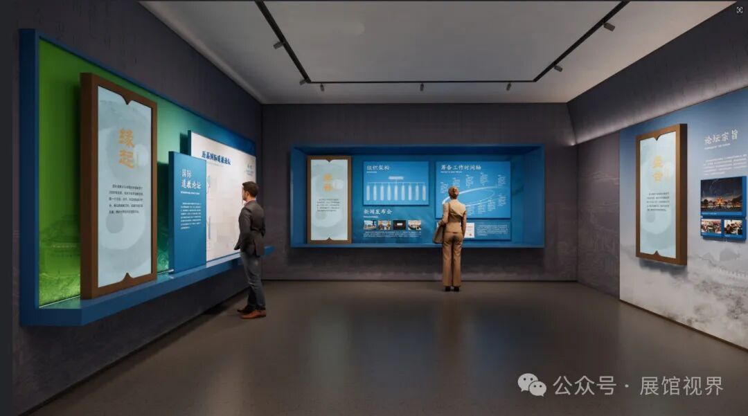 整个空间色彩以蓝色、绿色和灰色为主。蓝色的展示板尤为突出,给人一种专业、冷静的感觉。绿色背景的展示板增添了一丝自然和生机,而灰色的墙面则起到了很好的衬托作用,使展示内容更加醒目。展馆采用了多种展示手法,包括图文并茂的展板、电子屏幕和立体展示,电子屏幕上可能播放着相关的视频或动态信息,增加了展示的互动性和趣味性。