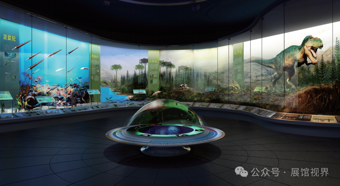依托环形墙壁形成地球演化走廊,展示从太古代、元古代、古生代的地球生命演化史。演化走廊将地球事件、植物事件、动物事件结合起来,采用立体景观、伴景画、化石陈列等手段,构建了立体丰富的地球生物演化轨迹。展厅中心区营造平面电子景观,配以生命钟的刻度表,浓缩46亿年地球演化史。中心地投屏演示地球的形成过程。
