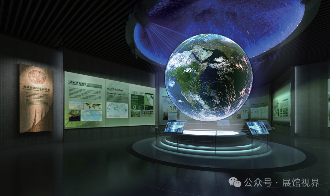 这是展示林业资源与森林生态功能的展示空间。中间的大地球是一巨大的内投球,演示地球上森林覆盖率的变化,周围的触摸屏可与之互动。展厅的展板以丰富详实的图文,解读森林的生态功能。