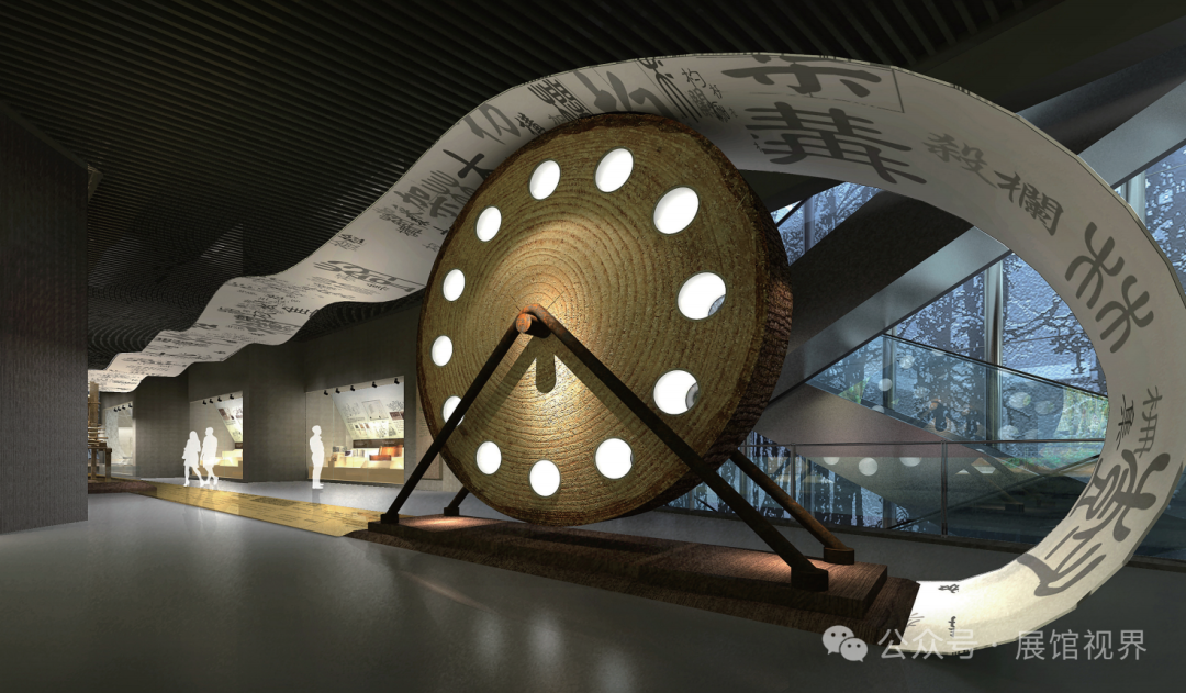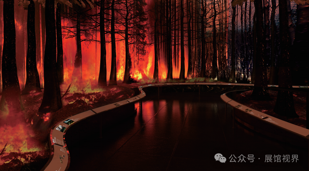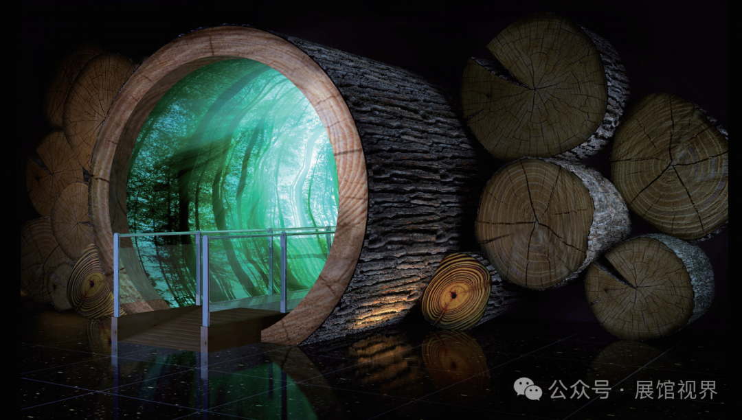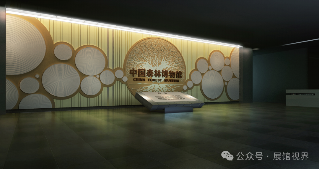 以主题墙为森林标识为主要元素,标识似一棵完整的树,树干部分是中国版图的形状,诠释了“中国森林博物馆”的馆名;标识又似茂密的森林,寓意中国将被森林覆盖并根深枝茂,体现了中国加强森林生态建设,积极应对自然恶化及建设和谐社会所作出的努力与贡献,彰显中国维护全球生态平衡的信心与决心。序厅的入口以树切口为设计,进入到树干内部即呈现沉浸式的时光隧道。