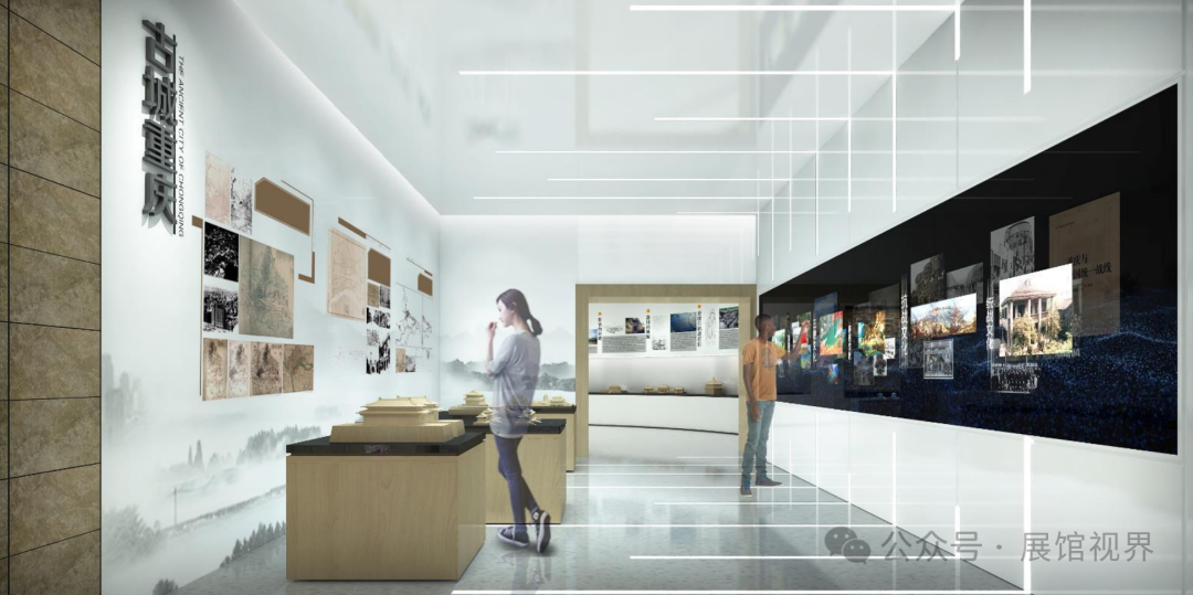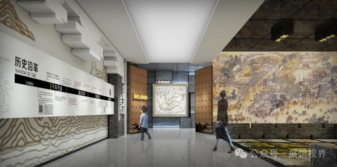 在展现古城重庆营城之道的区域,以重庆历史沿革(千年巴渝、重庆开埠、陪都抗战、直辖发展)为线索,打造了一袭简洁却富有内涵的历史长卷。它以时间为脉络,细致入微地再现重庆 “三千年江州城,八百年重庆府” 的悠久历史沿革。入口处,一扇大气磅礴的古城门缓缓打开,那古老的吱呀声仿佛在诉说着往昔的故事,热情欢迎观众穿越时空的隧道,走进充满历史韵味的 “古城重庆”,开启一场探寻重庆历史文化的奇妙之旅。