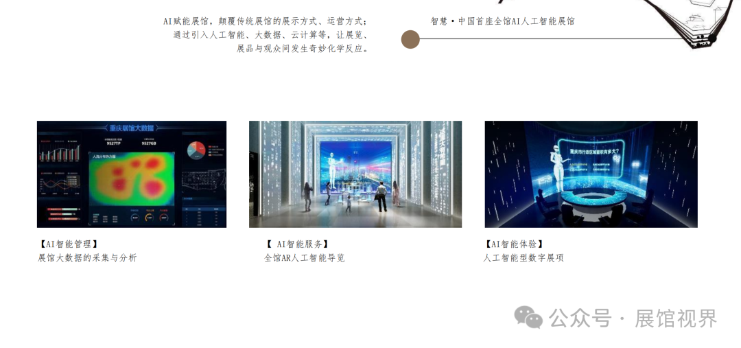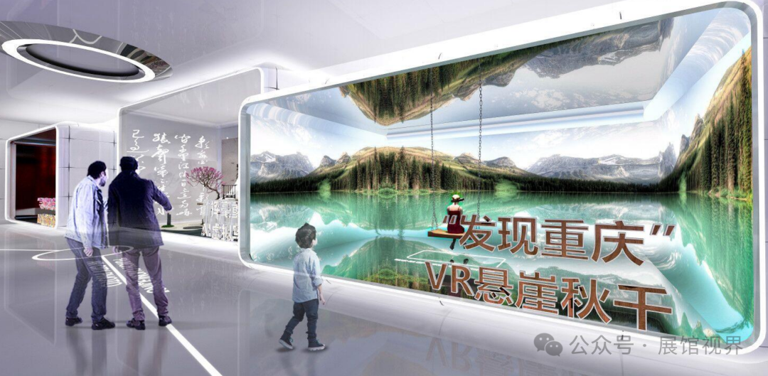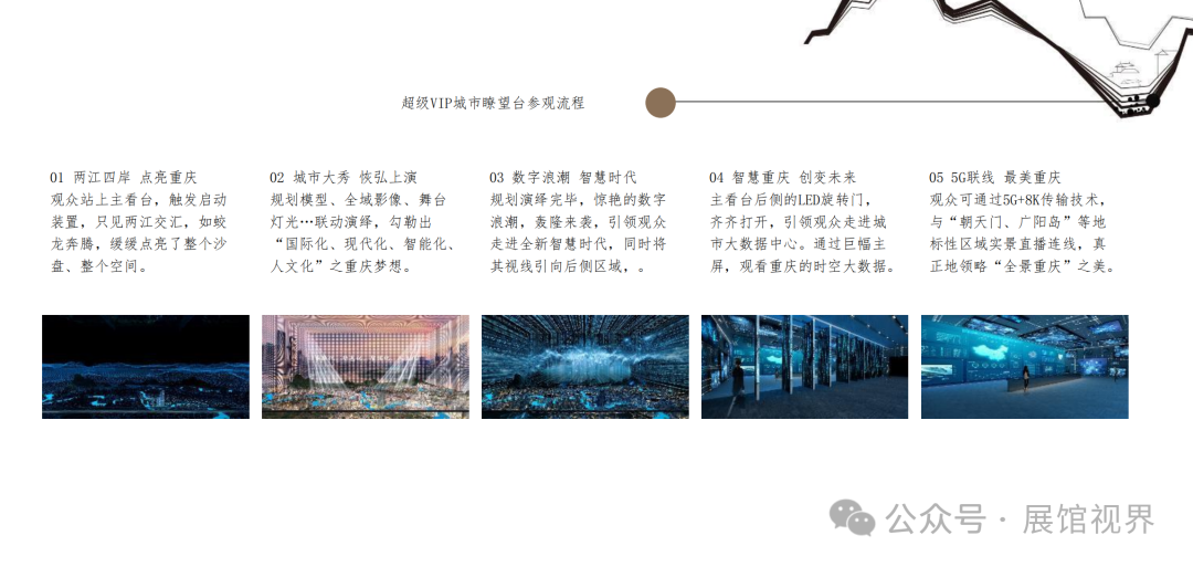 前厅空间设计:以 “城市之门” 为概念展开整体空间设计,引领观众一步步深入精彩纷呈的 “重庆世界”。整个前厅造型在透光板下内衬 LED 条屏,灵动呈现习近平总书记寄语重庆的 “两点定位、两高目标” 等重要内容。展馆内的 AR 导游还会重点介绍重庆的 “区位、生态、产业和体制优势”(四大优势),让观众能够更深刻地体会到 “这里大有希望”,全方位感受重庆的发展潜力与无限可能。