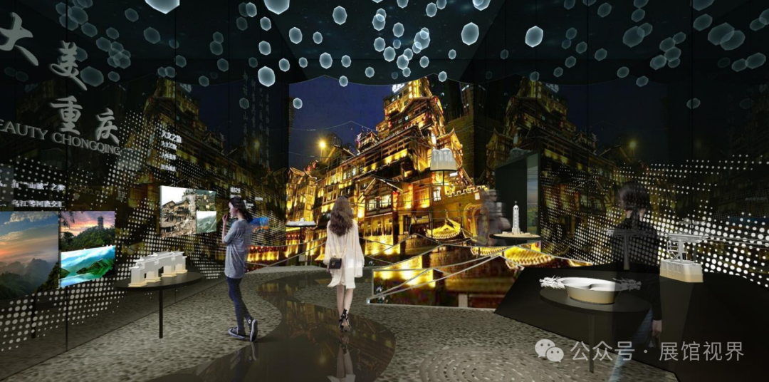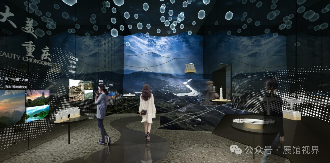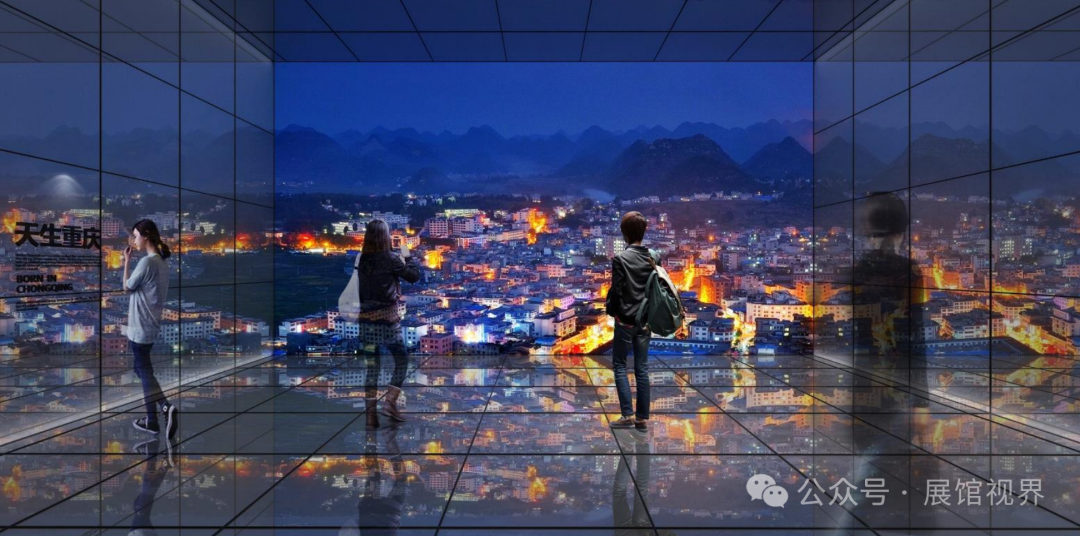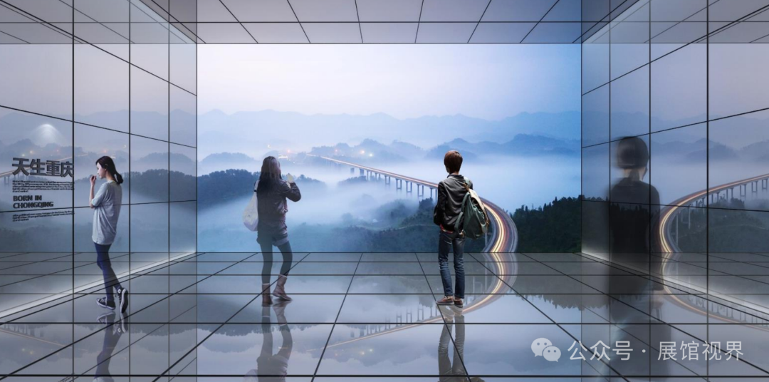 在 “天生重庆” 镜像空间,将重庆的各项自然资源集中汇聚于一处影像空间中,生动诠释 “山水林田湖,是一个生命共同体” 的理念。观众只需隔空挥手,就能点亮 LED 大屏,紧接着,一幕幕最美重庆风景便会随之跃然眼前,生动再现重庆浑然天成的自然之美。此外,全域镜像设计营造出万花筒般的视觉特效,给观众带来强烈的视觉冲击,使其沉浸在重庆独特的自然魅力之中,感受大自然的鬼斧神工。