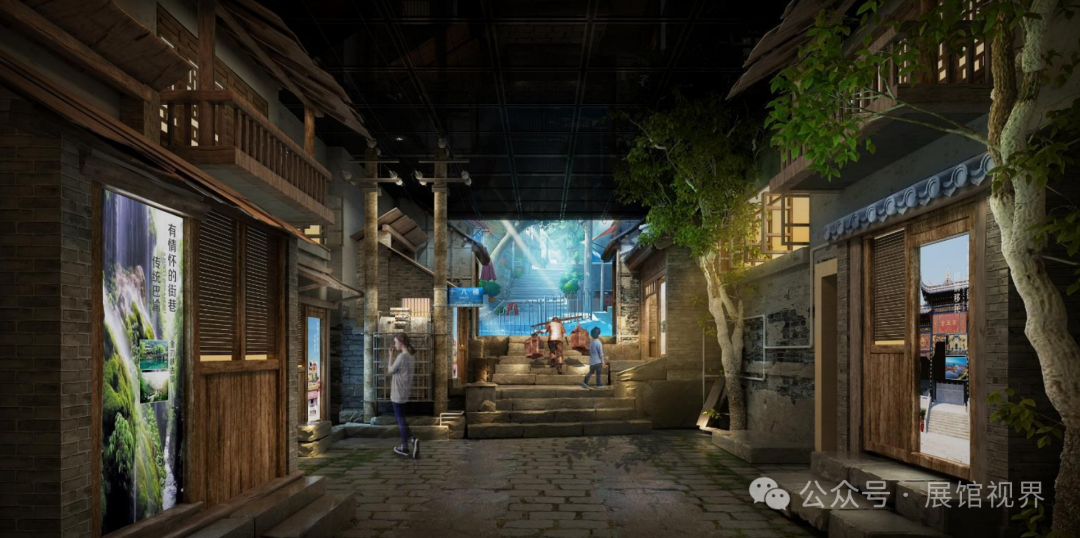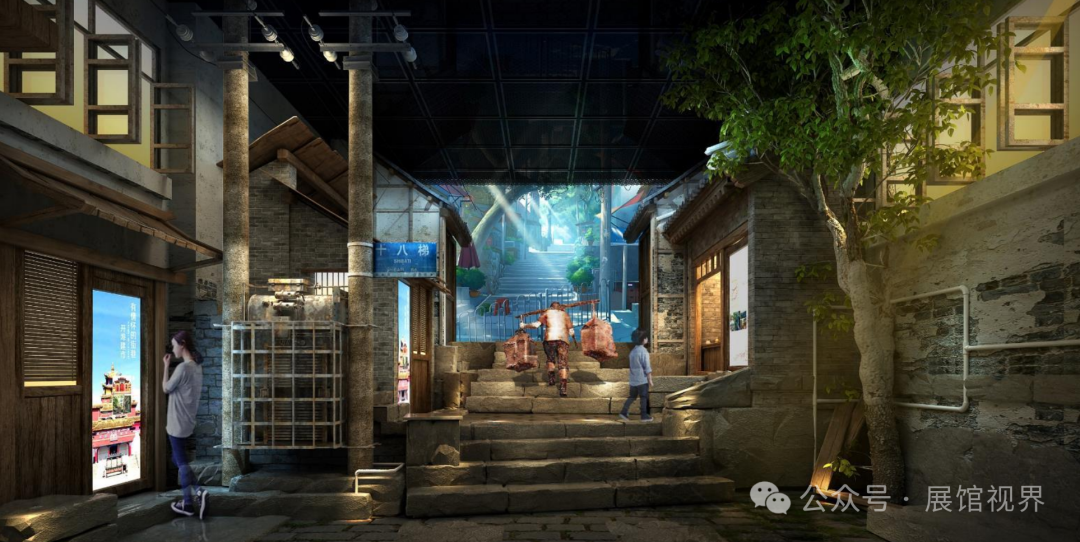 在巴渝乡愁(有情怀的街巷)历史街区保护展示区域,基于传统巴渝、明清移民、开埠建市、抗战陪都、西南大区不同历史时期的特色,进行了栩栩如生的场景复原,高度还原了重庆地标街区 —— 十八梯。街区中,结合雕塑复原的 “棒棒军” 形象,生动地诠释出浓浓的巴渝乡愁,唤起人们对老重庆的记忆与情感。后方的数字影像呈现出动态的十八梯街景,人来人往,热闹非凡,让观众仿若真正置身于 “十八梯”,身临其境地感受重庆在历史文化风貌区保护方面的用心与成果,体悟这座城市深厚的历史底蕴和独特的人文魅力。