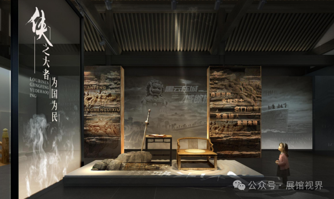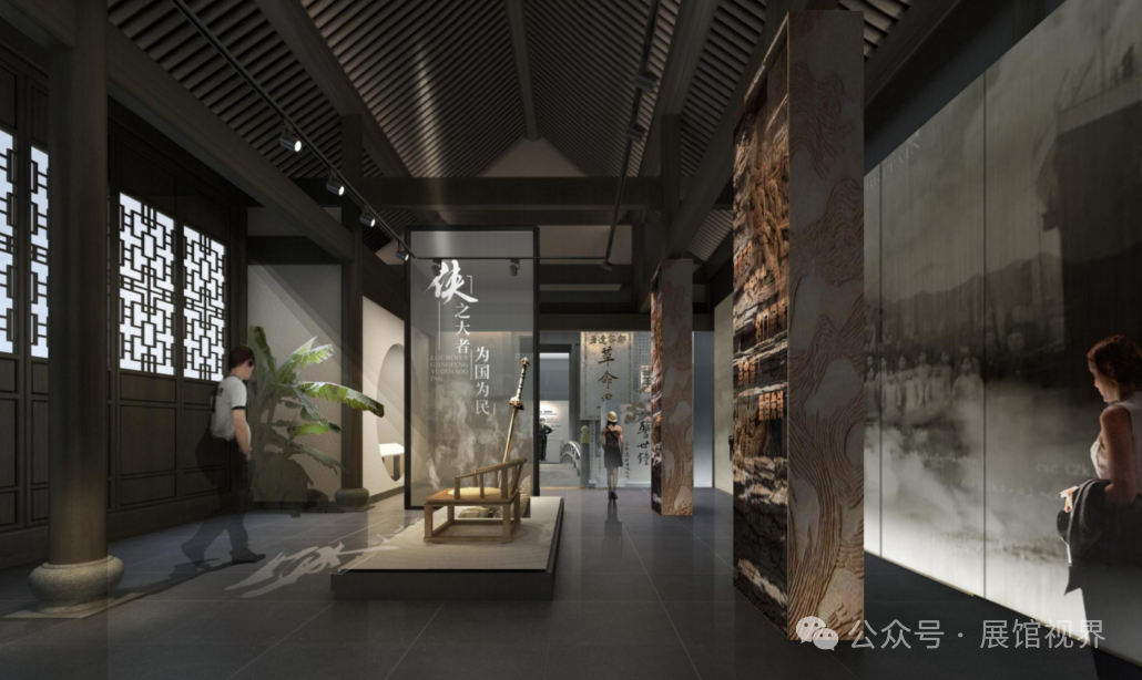 整体设计巧妙地融合了现代与传统中式元素。木质框架与展示柜散发着古朴的气息,简洁的线条与现代的灯光设计相得益彰,共同营造出一种古典与现代交织的独特氛围。运用展示雕像、雕刻以及剪纸工艺等设计手法,生动地塑造出一位文武双修的鉴湖女侠的光辉形象。