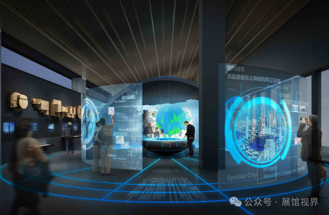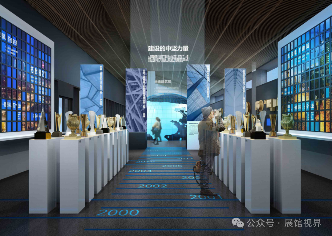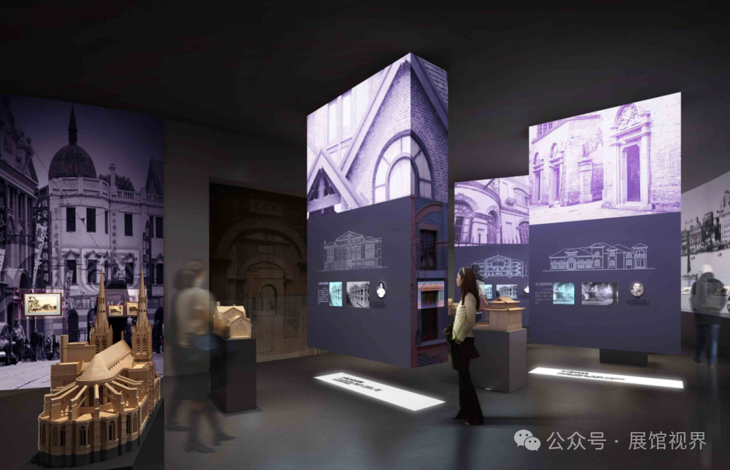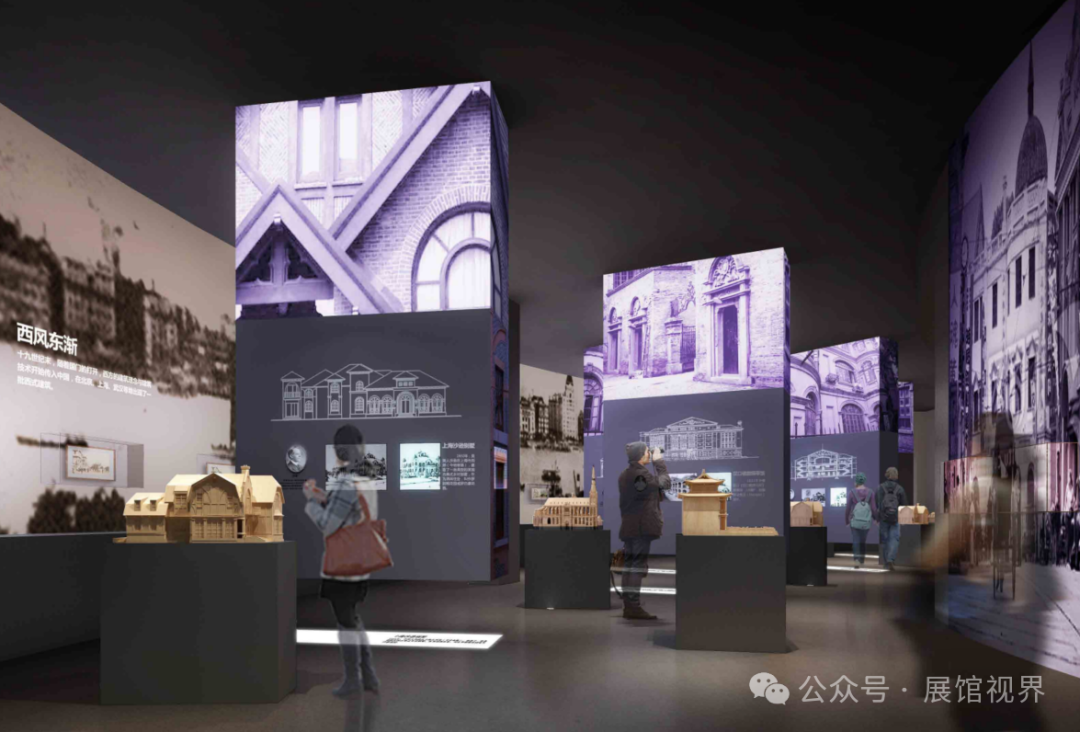 中国近代建筑科技在发展过程中呈现出独特的风貌。设计以吊装悬挂的设计,并结合实物模型配以投影的展现形式,为建筑的展示增添了新的维度与活力。这种独特的建筑展现形式与装配式建筑雏形的出现,共同构成了中国近代建筑科技的独特景观,为参观者展现了中国建筑在近代时期的创新与探索,使人们能够更加直观地感受到中国建筑科技的发展脉络与历史底蕴。