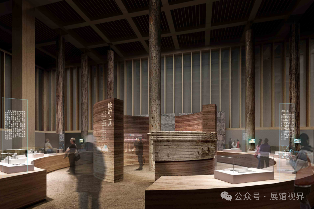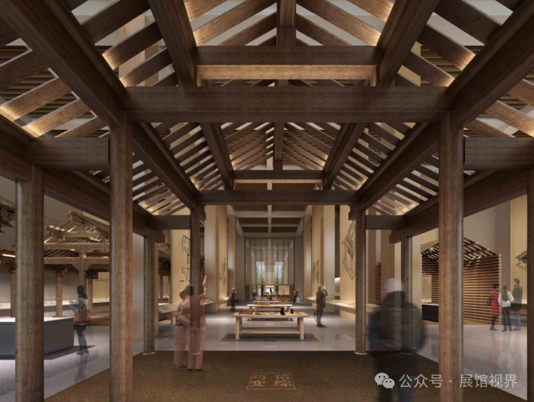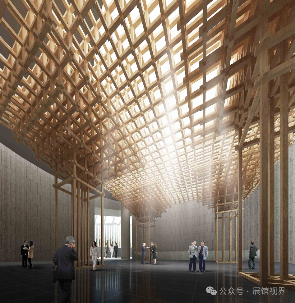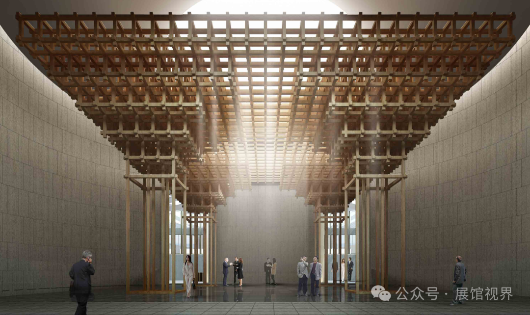 踏入正门,序厅跃然眼前。映入眼帘的是木结构设计,其井然有序的排列与富有节奏感的韵律,无声诉说着 “技术发展的终极归宿乃是对美学的不懈探寻” 这一理念。木质材料的运用,宛如冬日里的暖阳,为空间注入融融暖意,更如同将自然的质朴本真引入其中,赋予其浑然天成的质感。