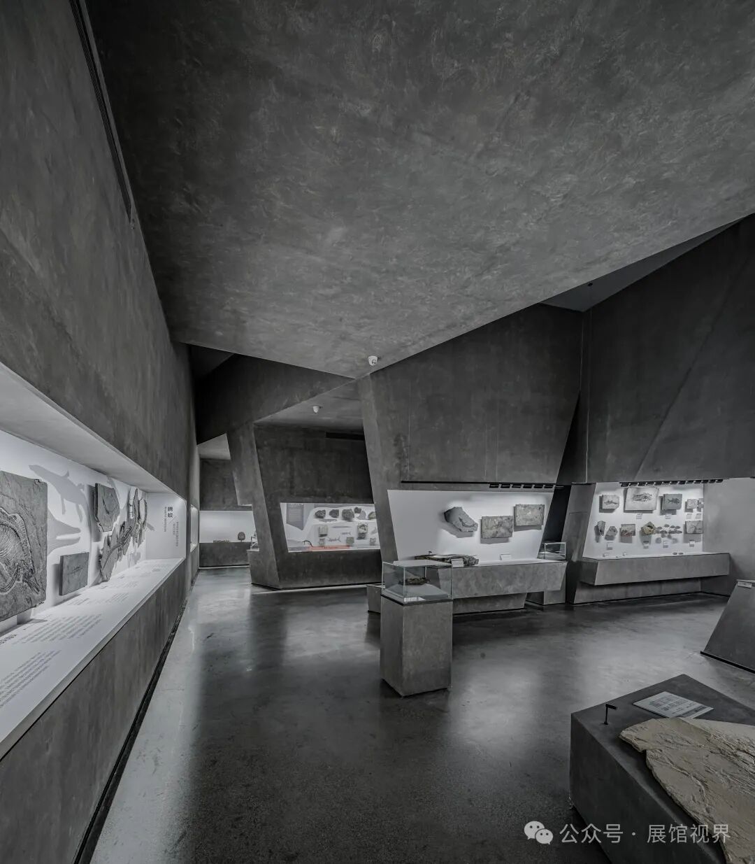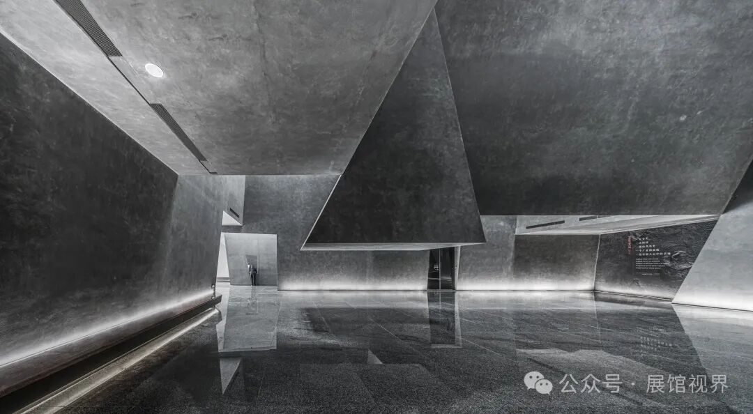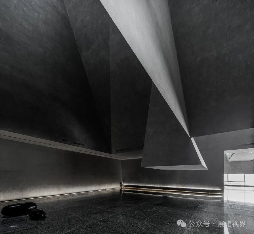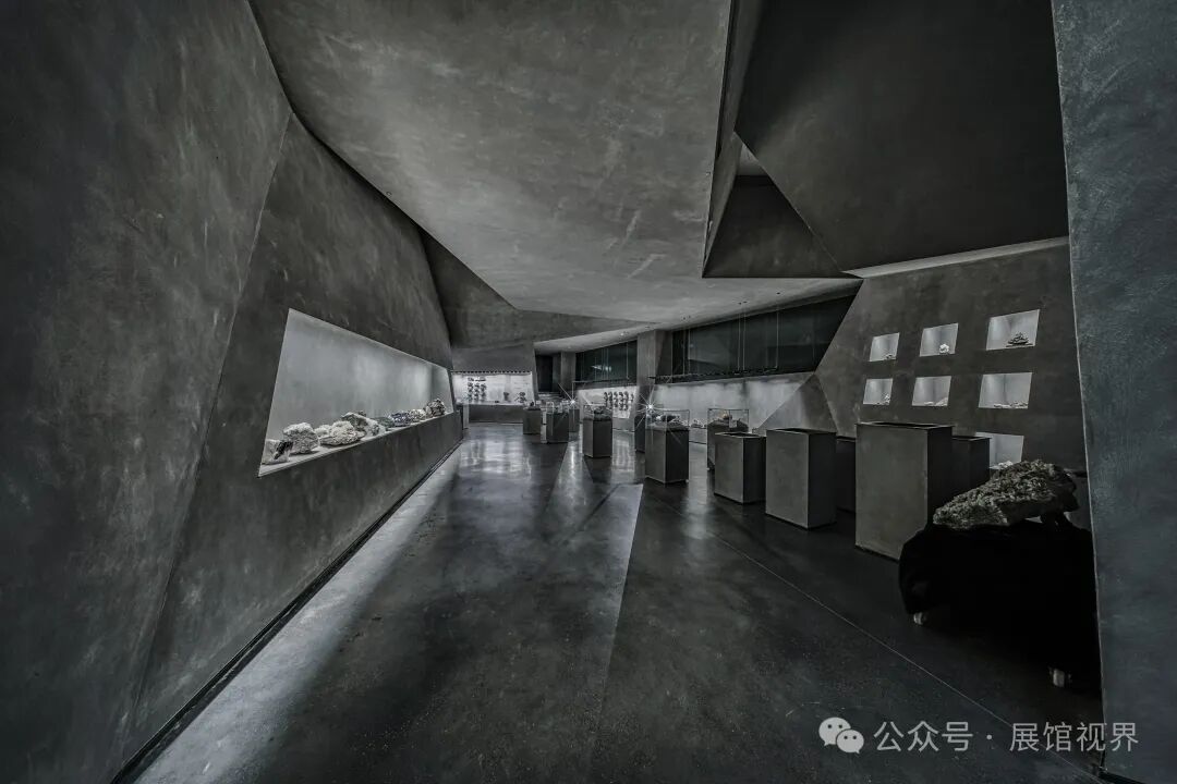 博物馆整个空间没有多余的装饰,用最原始的表达方式记录沉积亿万年的古生物印记,只使用了一个简单的构成元素——墙壁,这种简单性带来的是空间、尺度和光线体验的前置。墙壁不再仅仅是功能的分割界面,它的使用被重新创造:不仅带来平静冷峻的洞穴般的气氛衬托年代久远的地质化石展品;晶体的墙壁内部是博物馆的天花,墙壁外部承载了办公楼层的反光板功能,同时间隔了公共和私密两个分区。